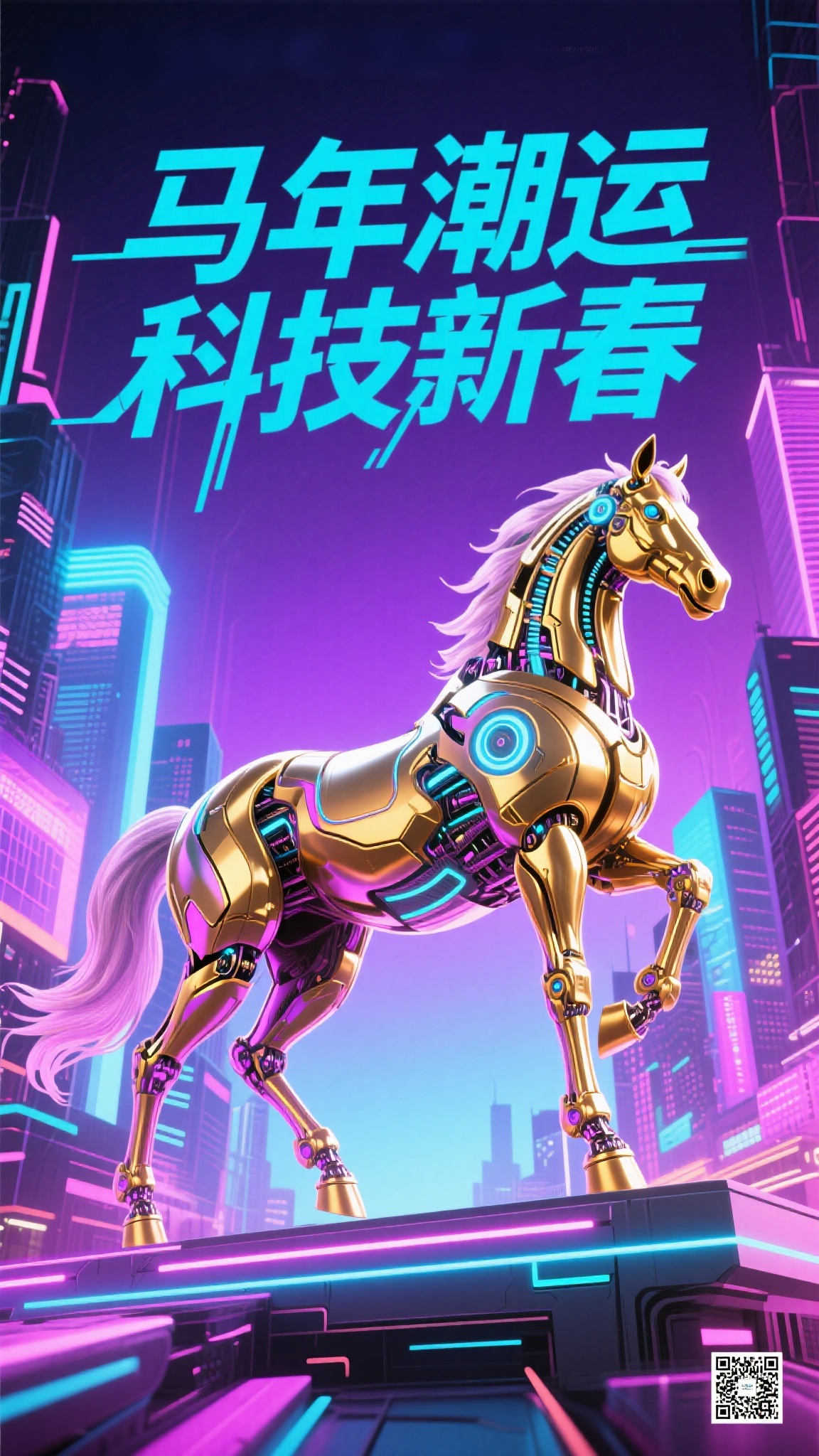 作品描述:赛博国潮风格,马年海报,机械金马(带霓虹光效),赛博城市背景,“马年潮运 科技新春” 文字,蓝紫渐变