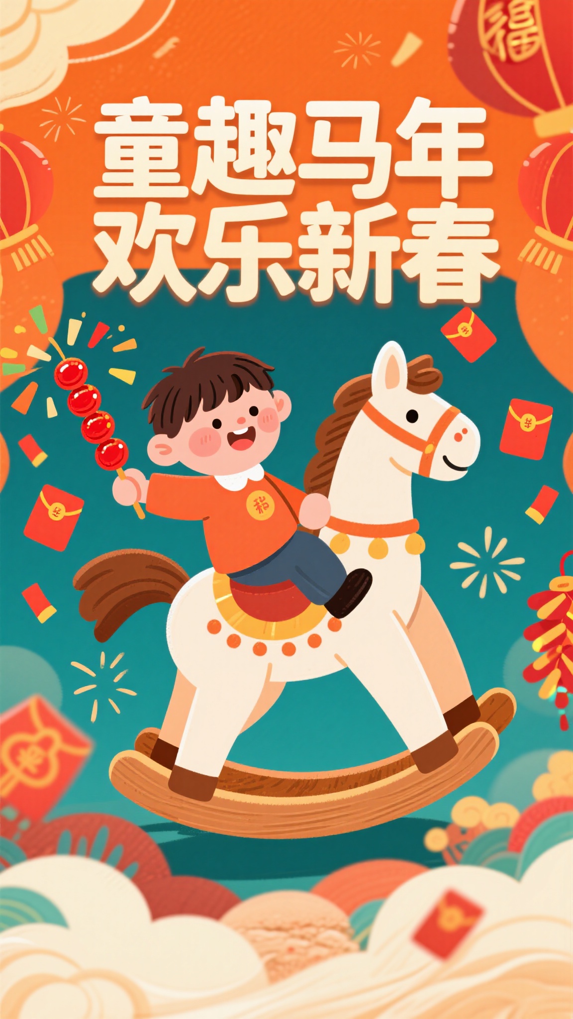 作品描述:儿童插画风格,马年海报,小孩骑木马放鞭炮,红包、糖葫芦点缀,“童趣马年 欢乐新春” 文字,暖橙背景