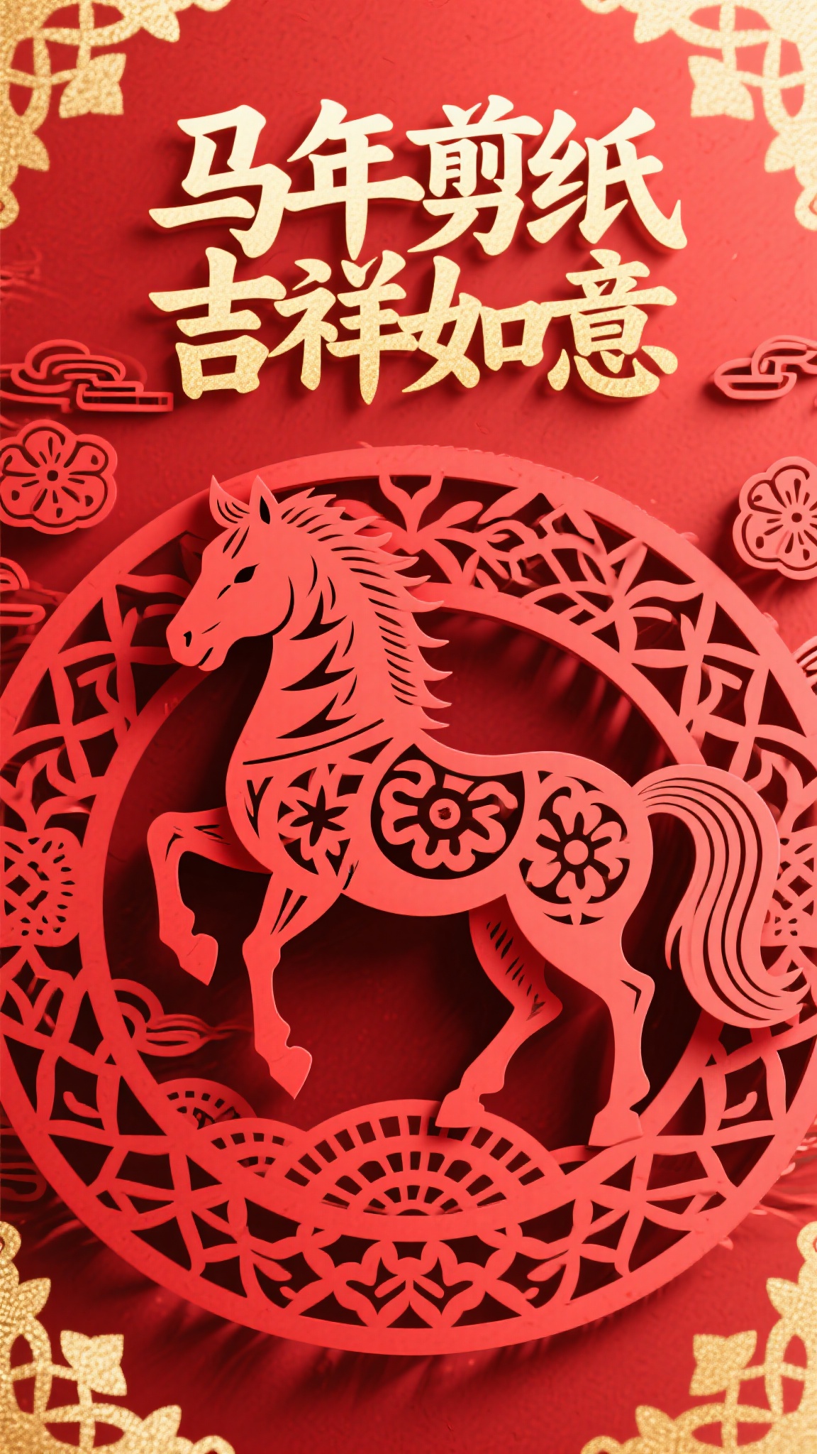 作品描述:立体剪纸风格,马年海报,红色立体剪纸马(镂空花纹),“马年剪纸 吉祥如意”文字,红底金纹