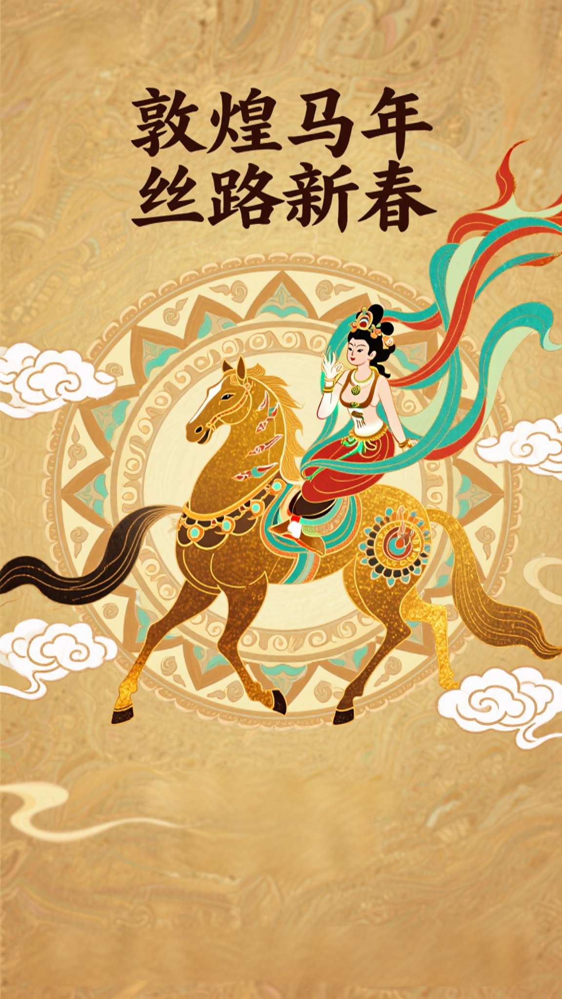 作品描述:敦煌壁画风格,马年海报,敦煌风金马(饰飞天纹样),祥云、藻井元素,“敦煌马年 丝路新春” 文字,暖金背景