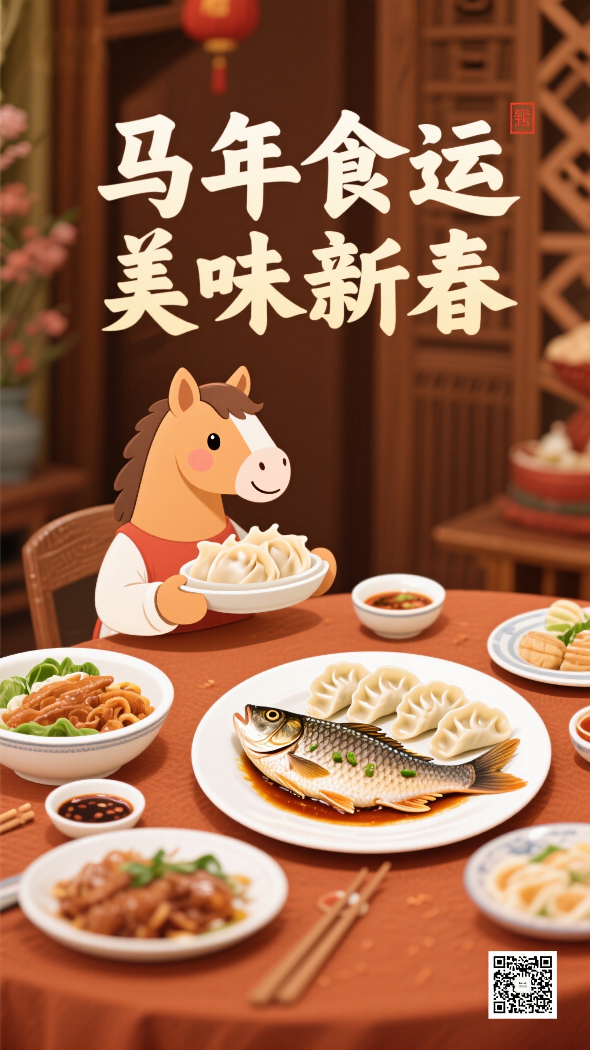 作品描述:美食结合风格,马年海报,小马端年夜饭(饺子、鱼),“马年食运 美味新春” 文字,暖棕背景