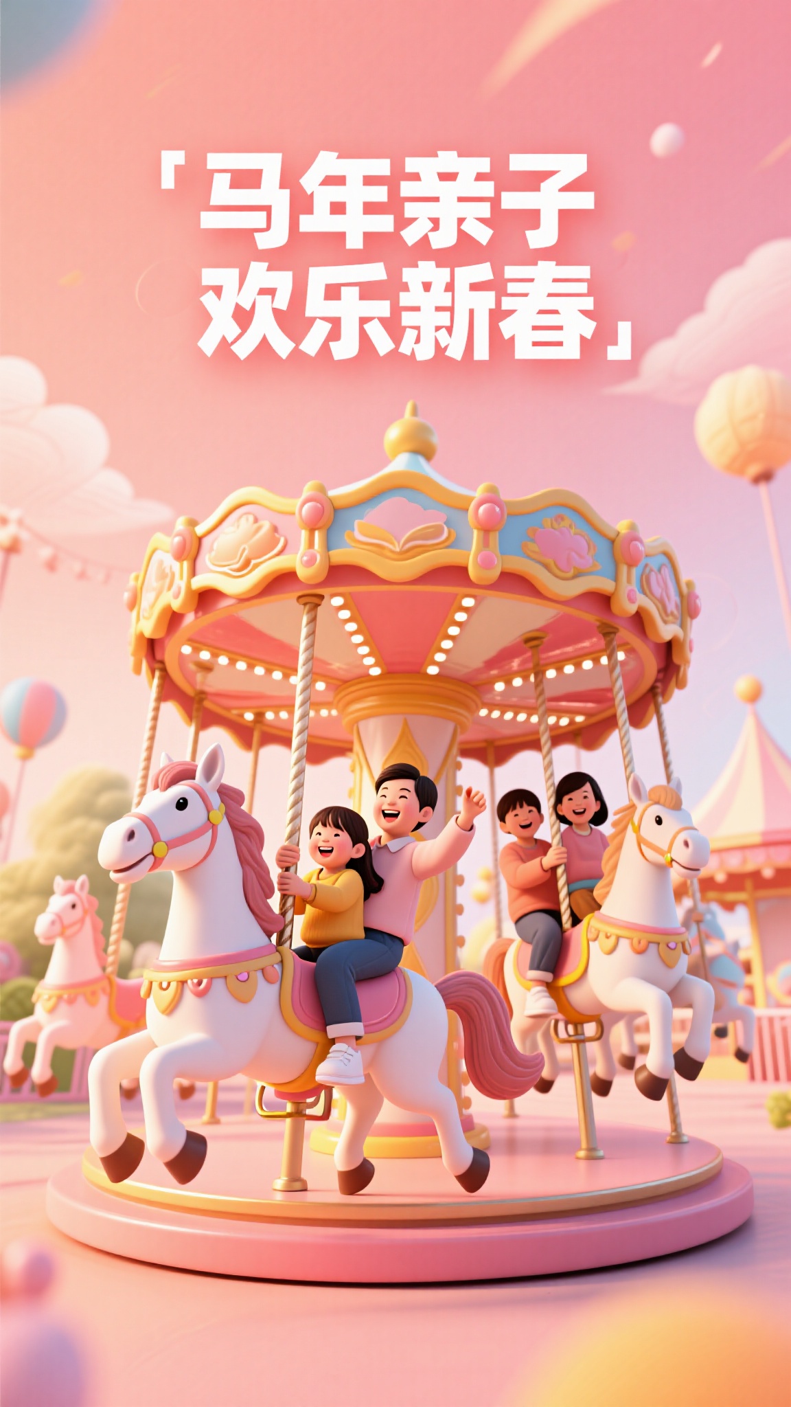 作品描述:亲子互动风格,马年海报,全家骑旋转木马,“马年亲子 欢乐新春” 文字,粉橙梦幻背景