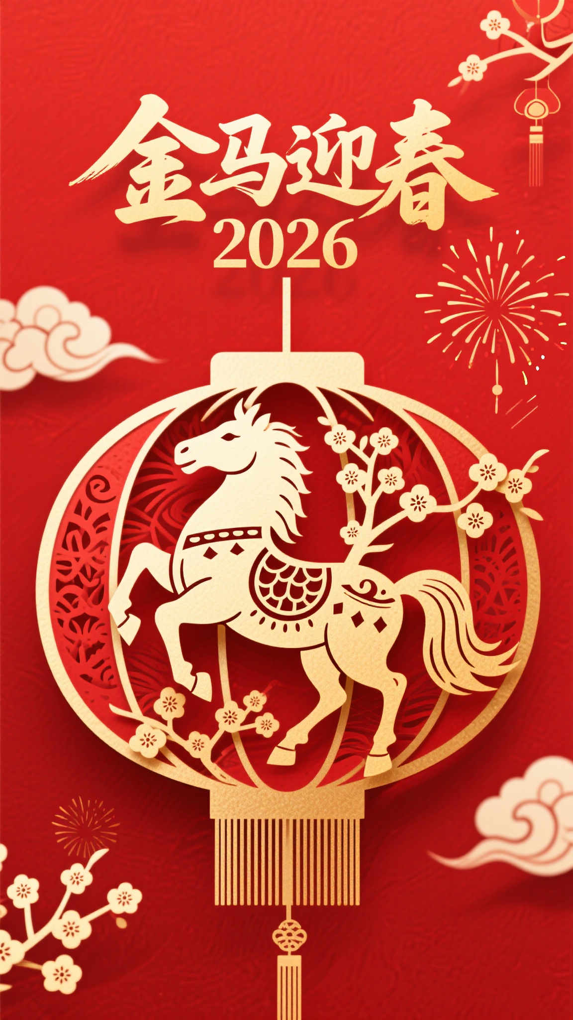 作品描述:剪纸灯笼风格,马年海报,红色背景,金色剪纸马造型灯笼,梅花枝、烟花、祥云点缀,“金马迎春 2026” 文字,传统喜庆