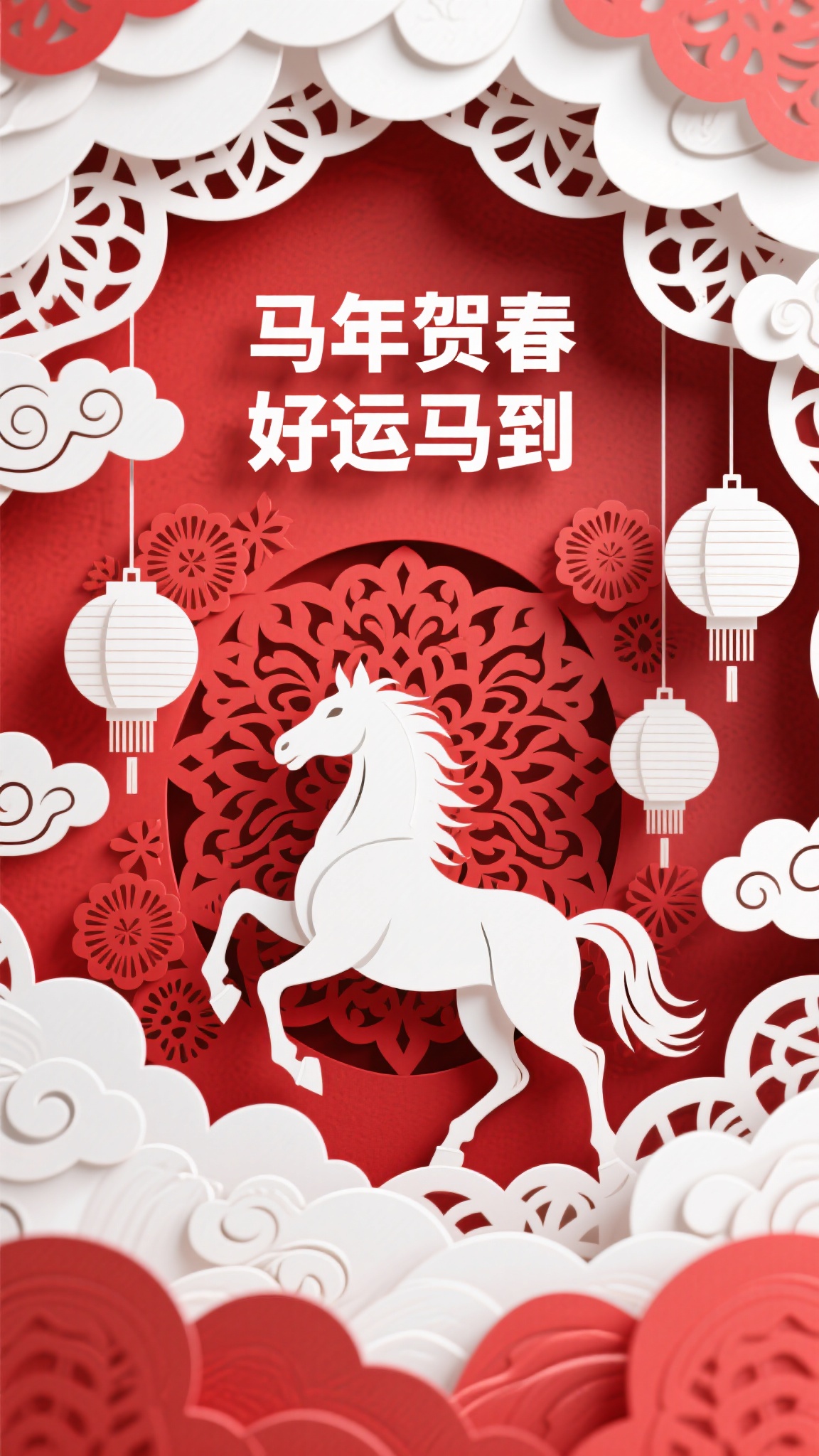 作品描述:立体剪纸风格,马年海报,红白配色,花纹装饰白马踏祥云,白色灯笼点缀,“马年贺春 好运马到” 文字,剪纸艺术感