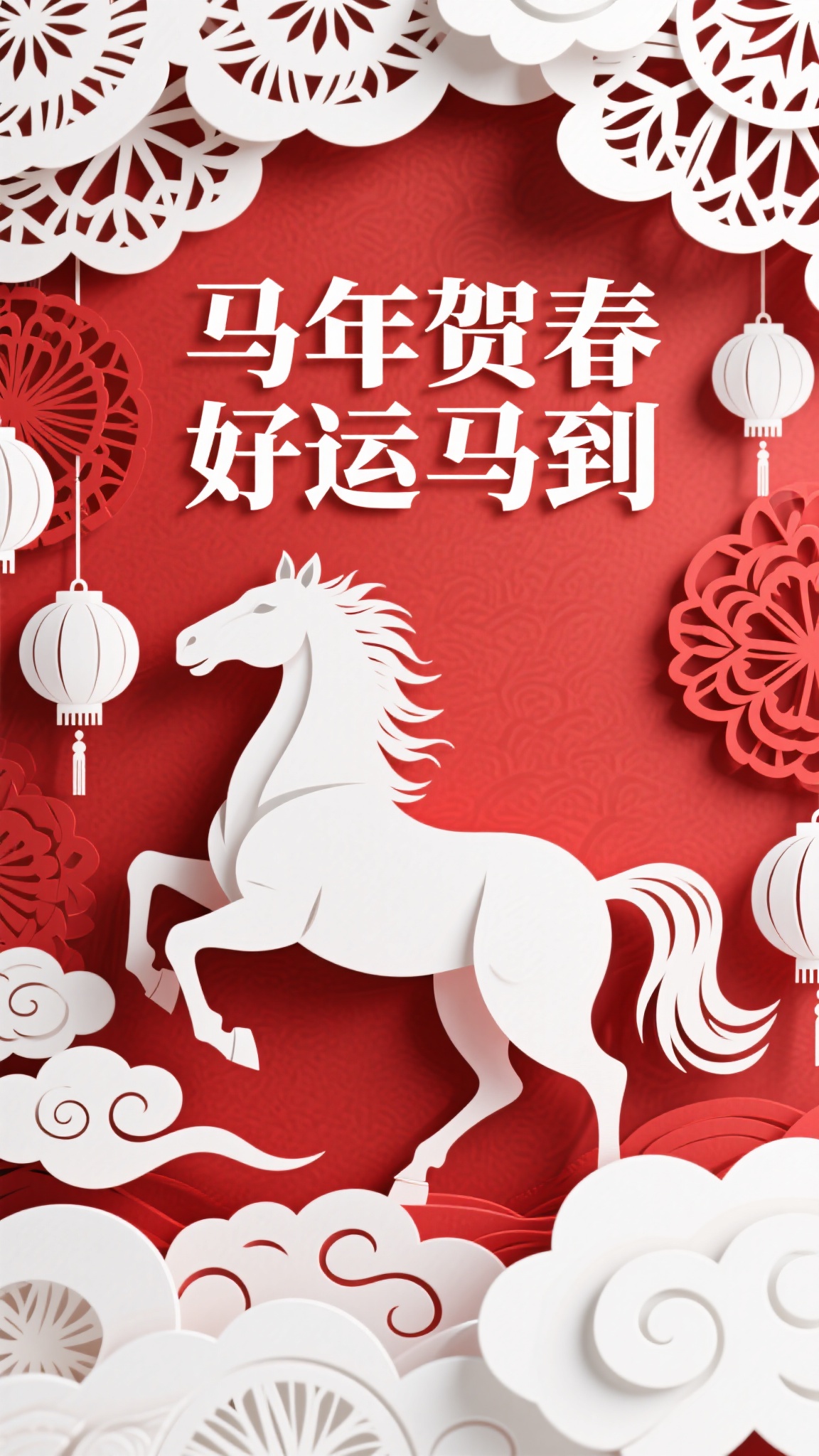 作品描述:立体剪纸风格,马年海报,红白配色,花纹装饰白马踏祥云,白色灯笼点缀,“马年贺春 好运马到” 文字,剪纸艺术感