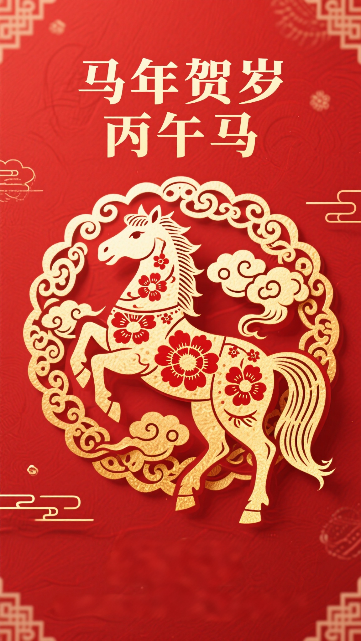 作品描述:金色剪纸风格,马年海报,红色背景,金色剪纸马饰红花,传统云纹环绕,“马年贺岁 丙午马” 文字,富贵传统