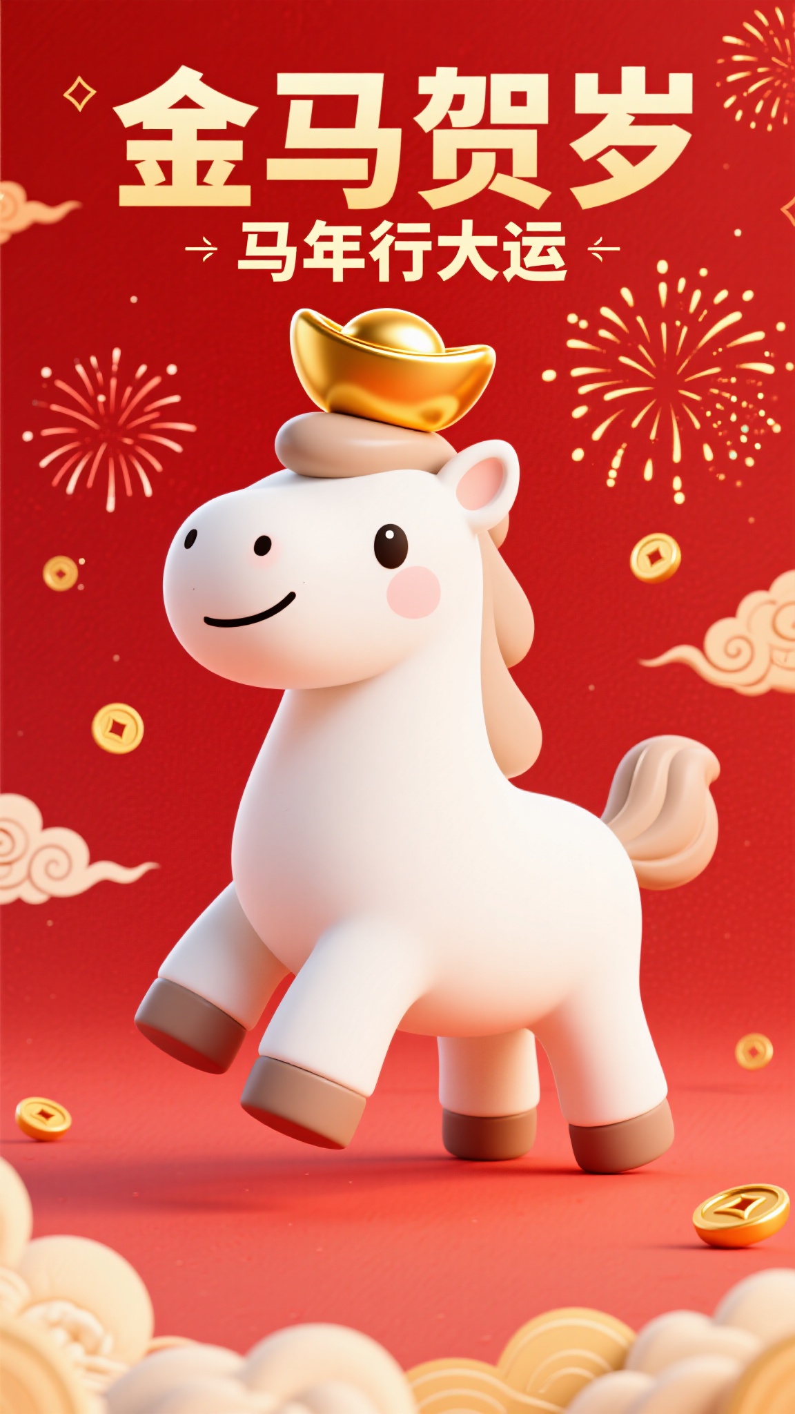 作品描述:3D 萌马贺岁风格,马年海报,红色背景,白色萌马顶金元宝,烟花、祥云点缀,“金马贺岁 马年行大运” 文字,萌趣贺岁