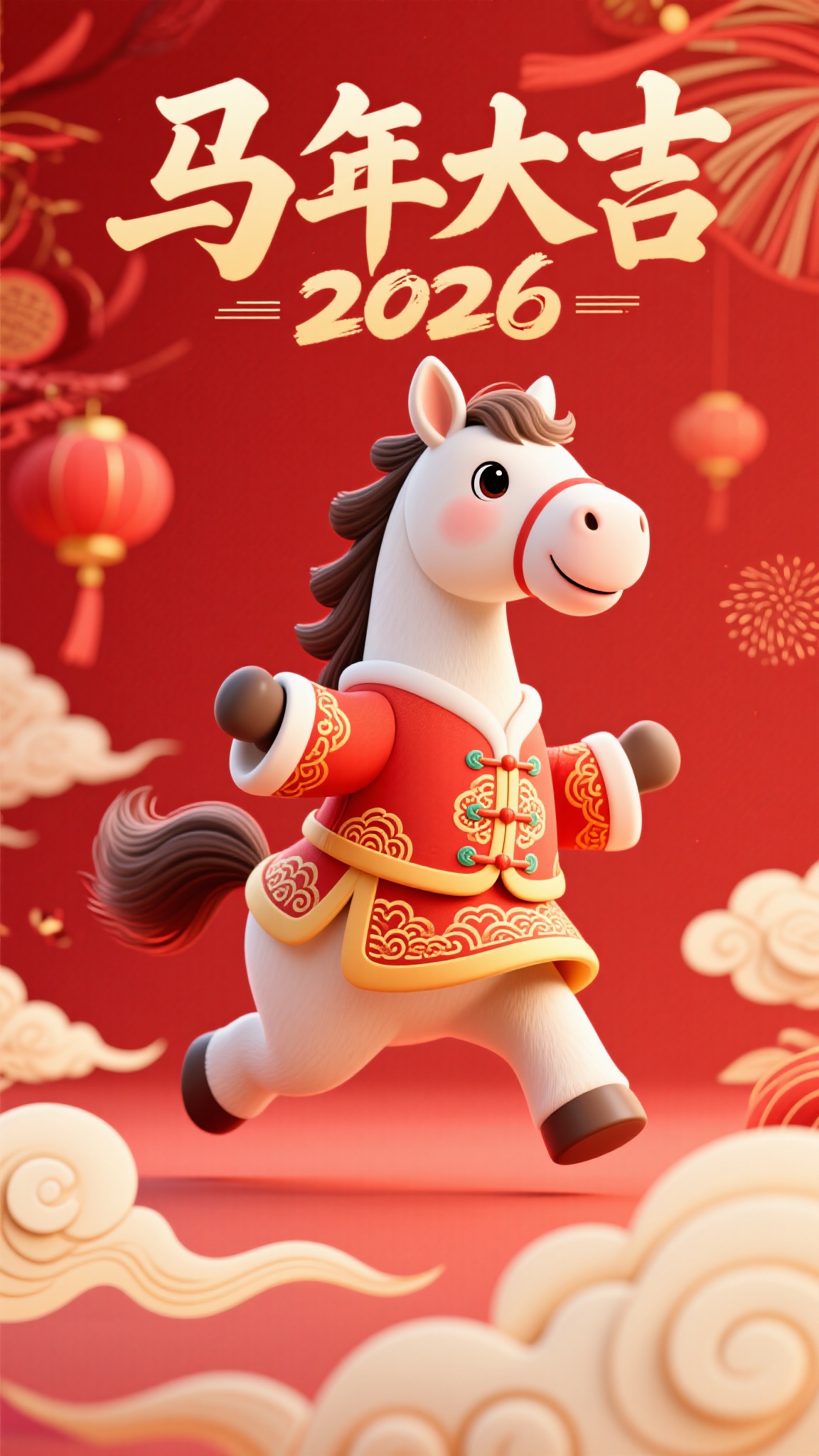 作品描述:3D 萌娃风格,马年海报,红色背景,萌马穿唐装踏祥云,“马年大吉 2026” 文字,童趣新年
