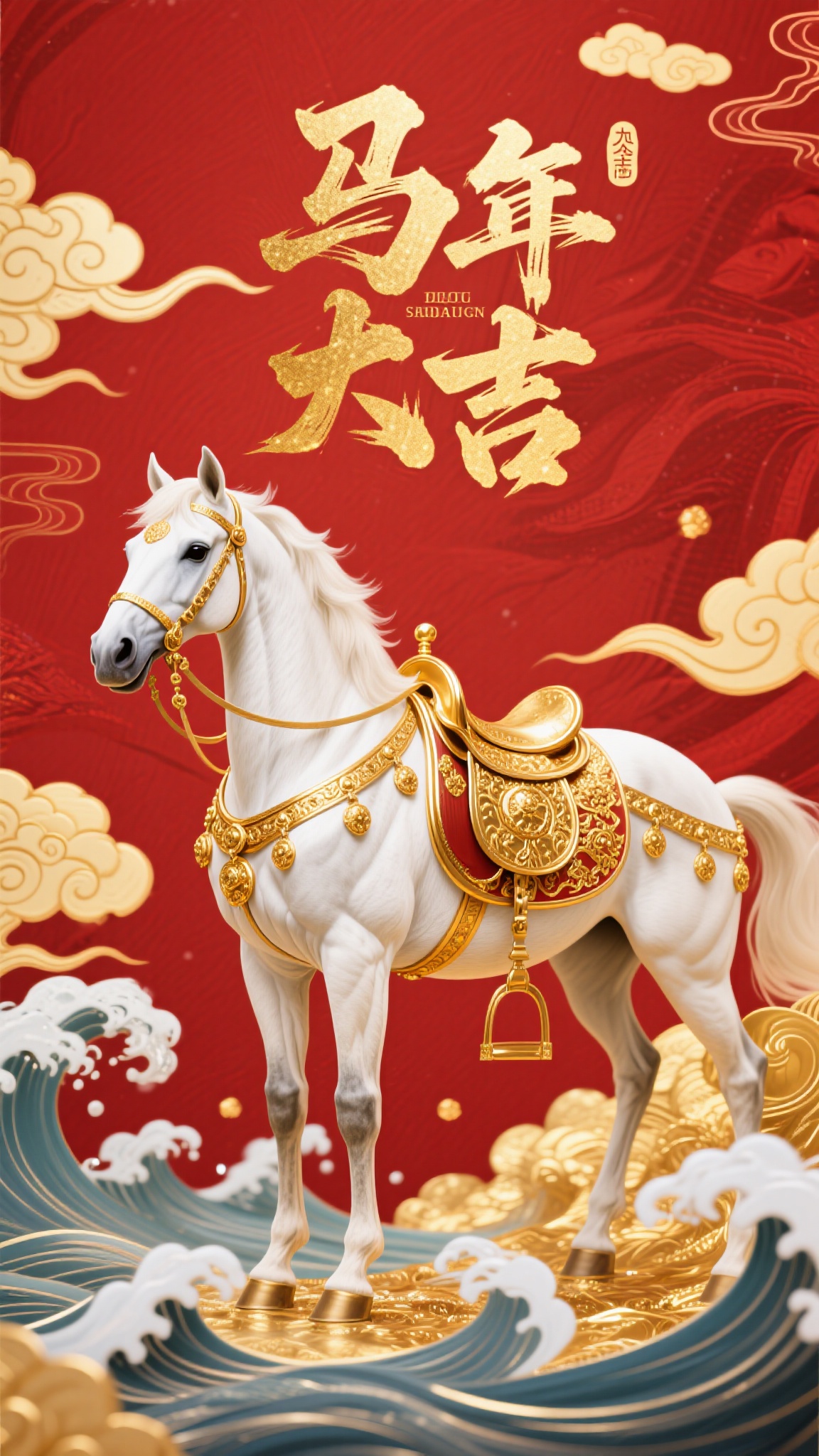 作品描述:国潮金鞍风格,马年海报,红色背景,白马配金色华丽鞍具,金云、海浪纹环绕,“马年大吉” 金色书法字,富贵大气
