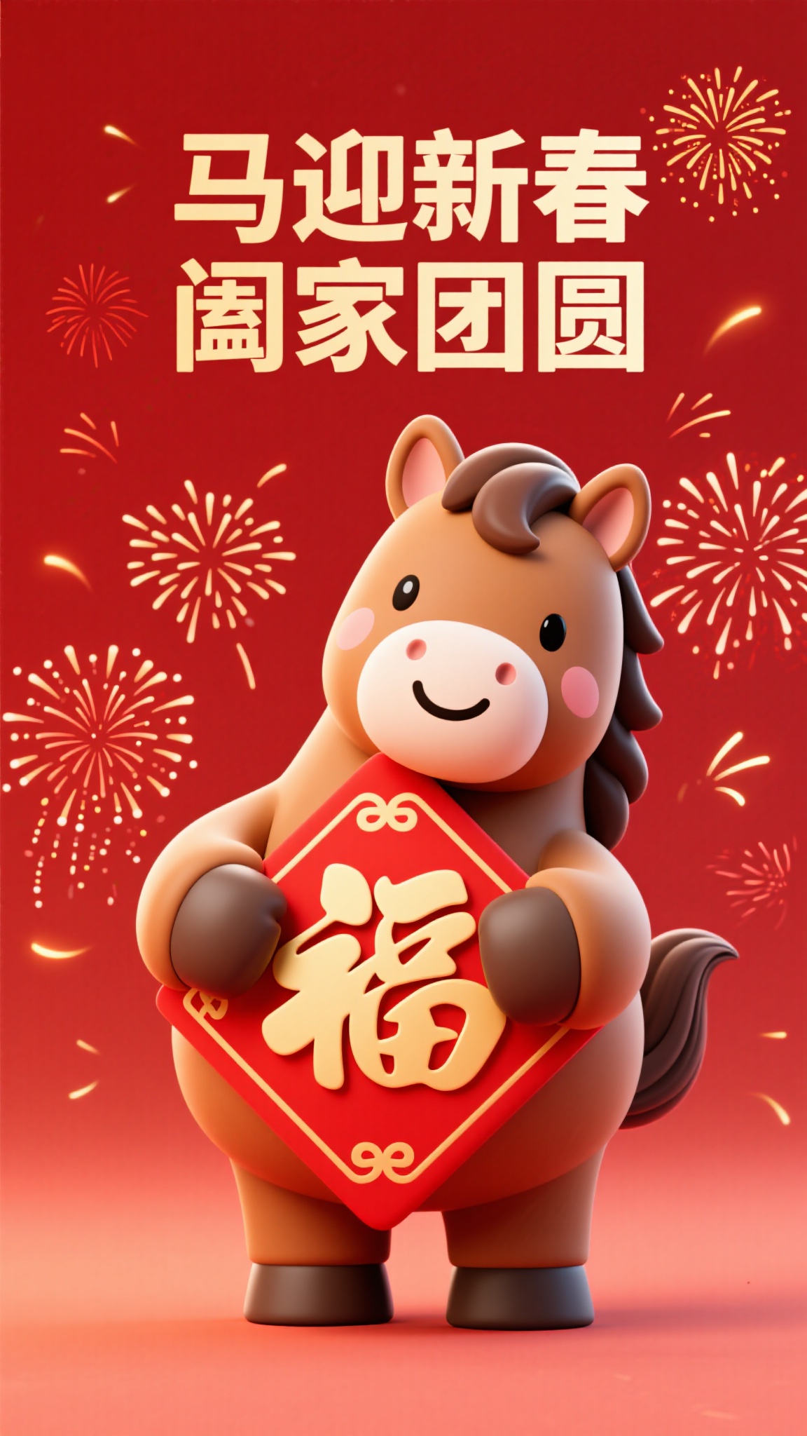 作品描述:3D 萌马抱福风格,马年海报,红色背景,棕萌马怀抱红 “福” 字,烟花环绕,“马迎新春 阖家团圆” 文字,可爱温馨