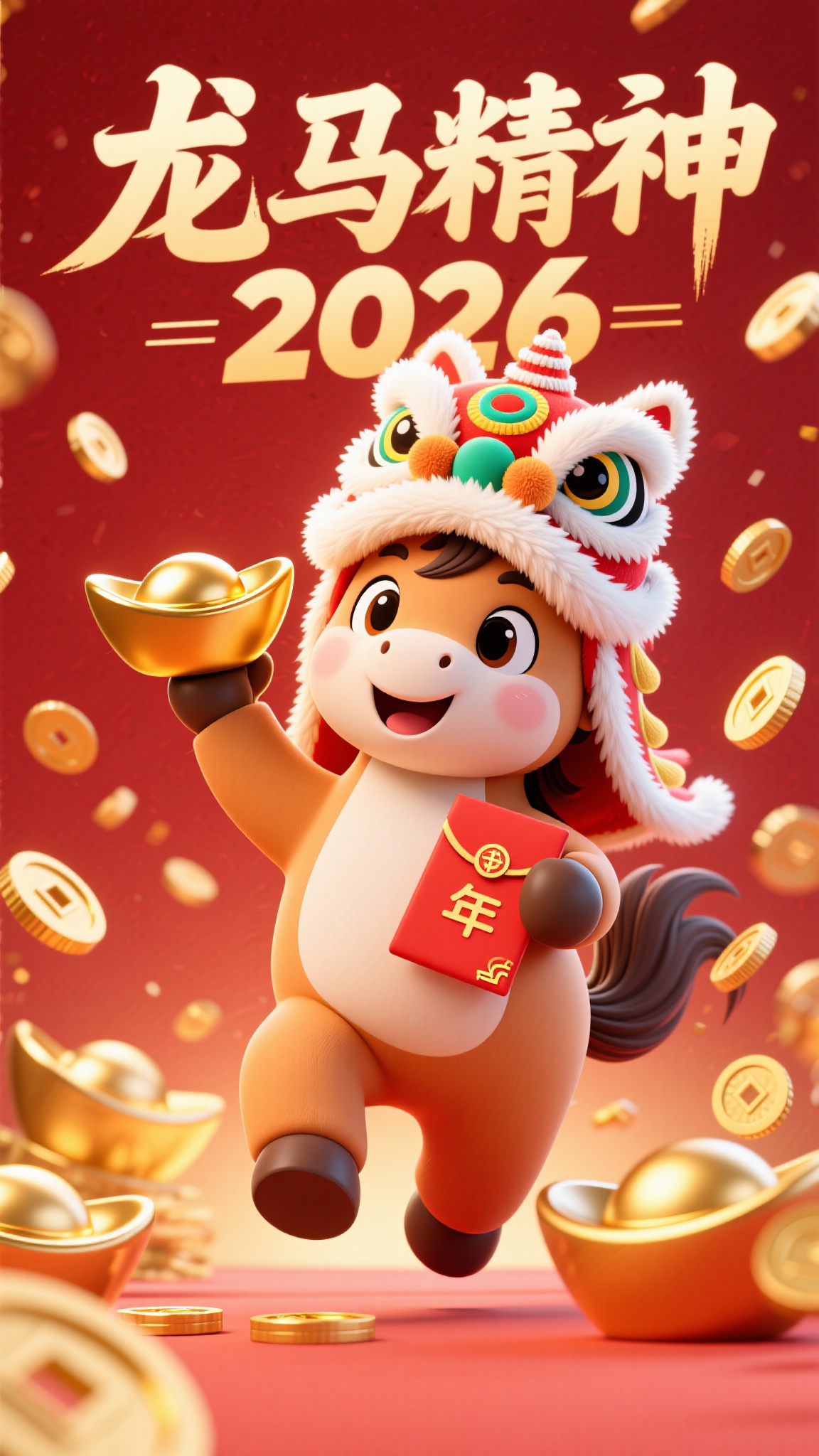 作品描述:3D 龙马精神风格,马年海报,红金背景,萌马戴舞狮头套,手持红包与金元宝,金币飞舞,“龙马精神 2026” 文字,活力财气