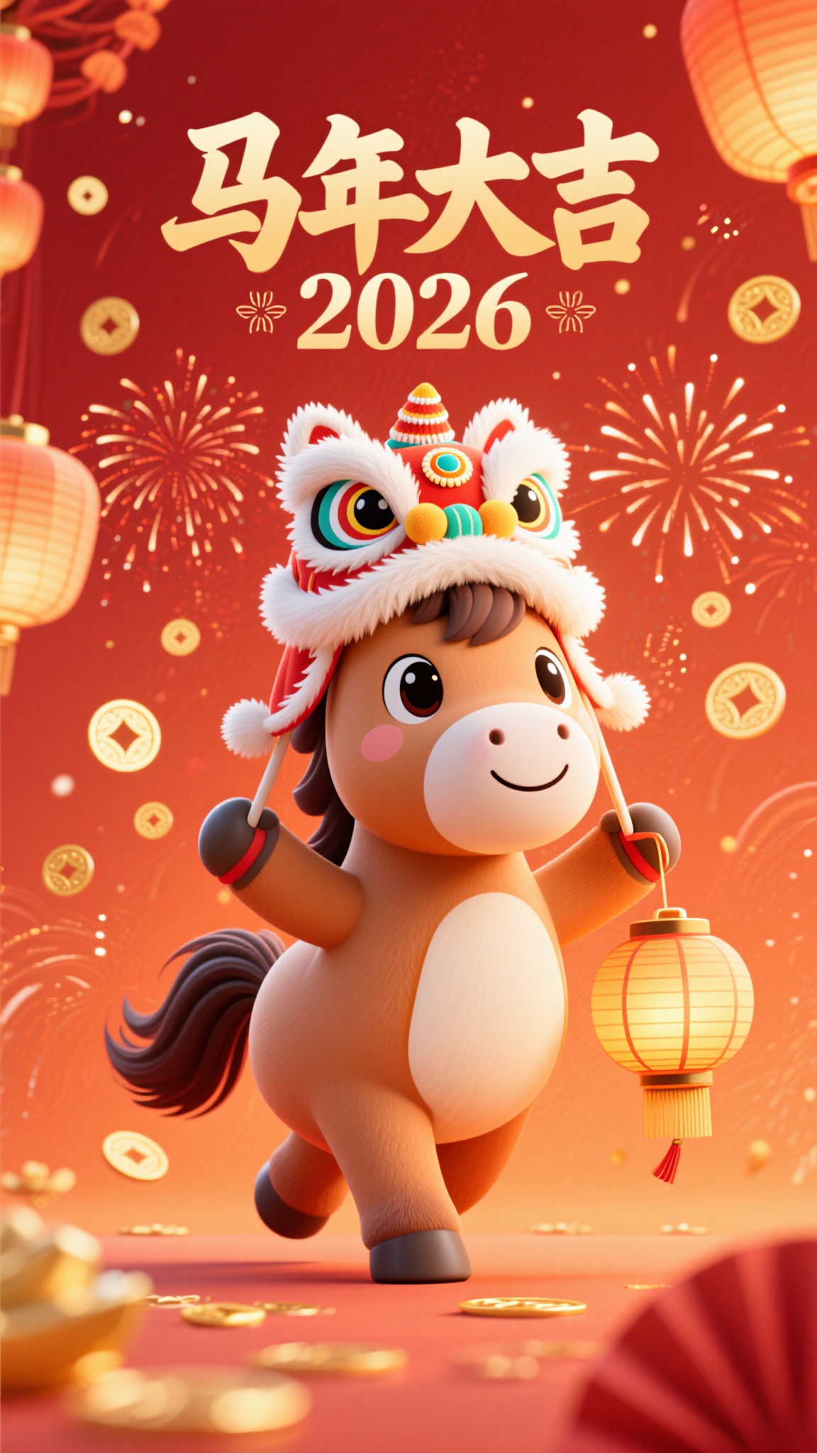 作品描述:3D 萌马闹春风格,马年海报,红橙背景,萌马戴舞狮头套提灯笼,烟花、金圆斑、灯笼点缀,“马年大吉 2026” 文字,热闹年味