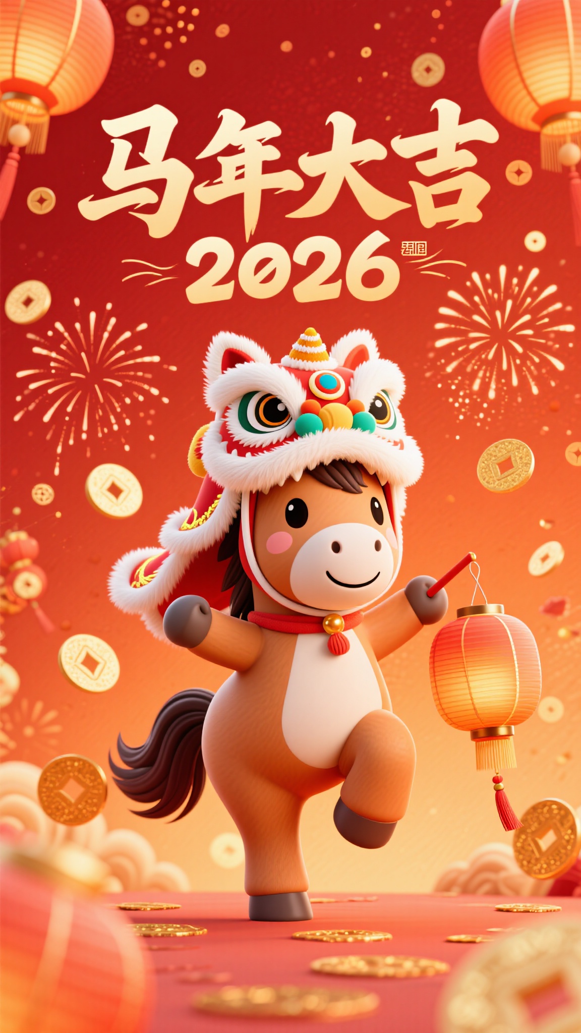 作品描述:3D 萌马闹春风格,马年海报,红橙背景,萌马戴舞狮头套提灯笼,烟花、金圆斑、灯笼点缀,“马年大吉 2026” 文字,热闹年味