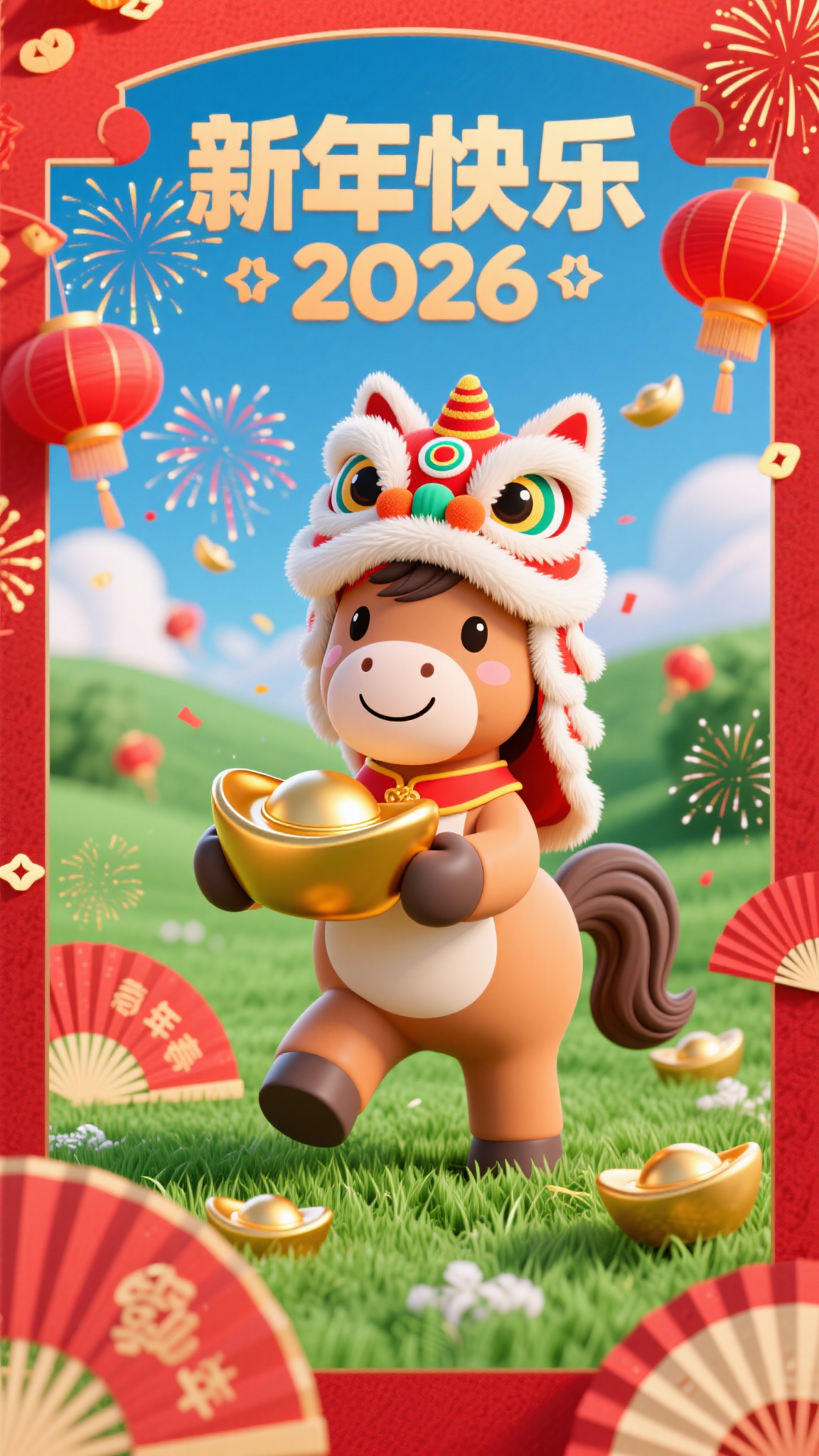 作品描述:3D 萌马迎春风格,马年海报,红绿草地背景,萌马戴舞狮头套持金元宝、红灯笼,烟花、灯笼、折扇环绕,“新年快乐 2026” 文字,户外新春氛围