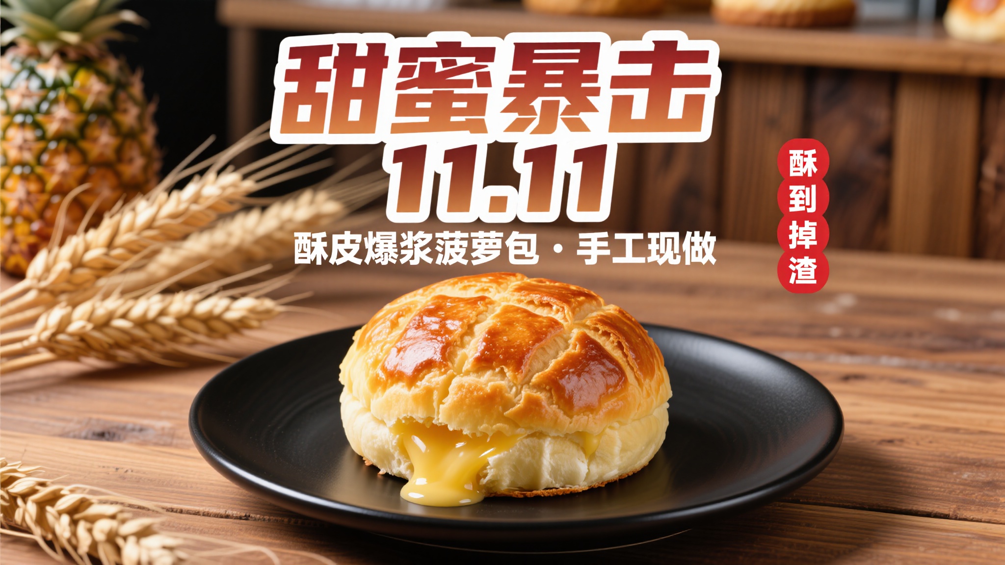 作品描述:3D 写实风菠萝包促销海报,核心载体是黑盘盛放的酥皮爆浆菠萝包(表面金黄焦脆,纹理如真实烘焙,爆浆感逼真);搭配木质桌面 + 麦穗背景(营造烘焙店真实场景);主标题 “甜蜜暴击 11.11” 为棕红渐变立体字(字边描白粗光,大气醒目),副标题 “酥皮爆浆菠萝包手工现做” 为白色细体;左侧有“酥到掉渣” 红色竖排字;背景为木质纹理,突出写实美食的质感。
