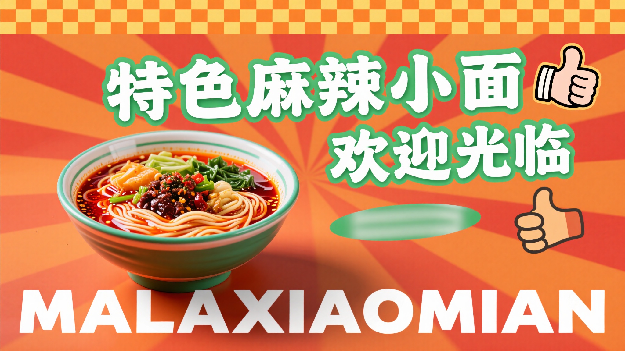 作品描述:3D 复古风麻辣小面促销海报,核心载体是橙绿渐变复古碗装麻辣小面(红油汤底、面条筋道、配菜丰富,如真实餐品);搭配橙黄格子顶边 + 放射状背景(复古促销氛围);主标题 “特色麻辣小面 欢迎光临” 为白绿渐变立体字(字边描绿粗光,复古醒目),右侧有 “赞” 字卡通点赞手;底部有 “MALAXIAOMIAN” 英文标识;背景为橙红渐变,强化复古餐饮的热烈感。