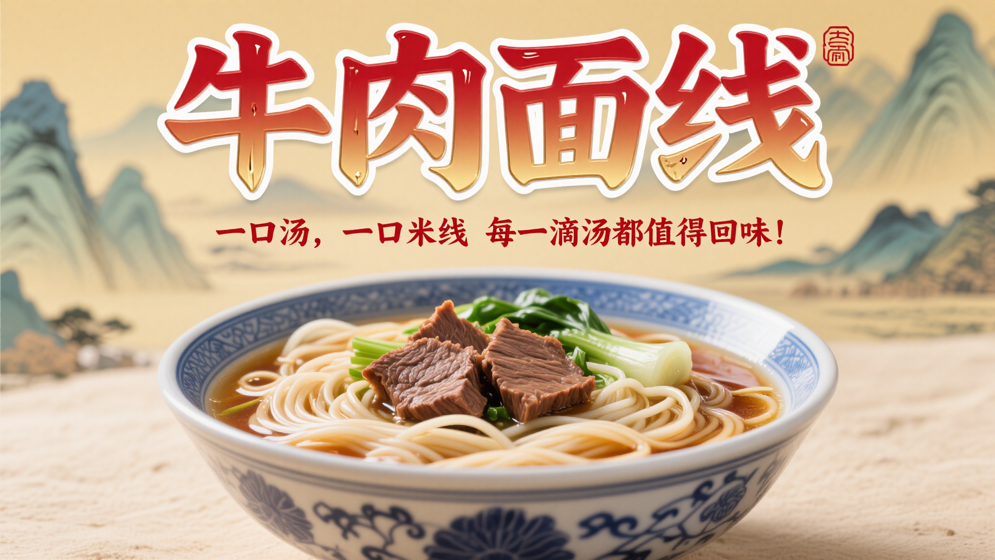 作品描述:3D 中式风牛肉面线海报,核心载体是蓝纹碗盛放的牛肉面线(牛肉软烂、面线筋道、配菜新鲜,如中式餐馆出品);搭配米黄做旧背景 + 山水纹理(营造中式餐饮氛围);主标题 “牛肉面线” 为红金渐变立体字(字边描白粗光,中式醒目),副标题 “一口汤,一口米线 每一滴汤都值得回味!” 为红色细体;背景为米黄山水渐变,突出中式美食的韵味。