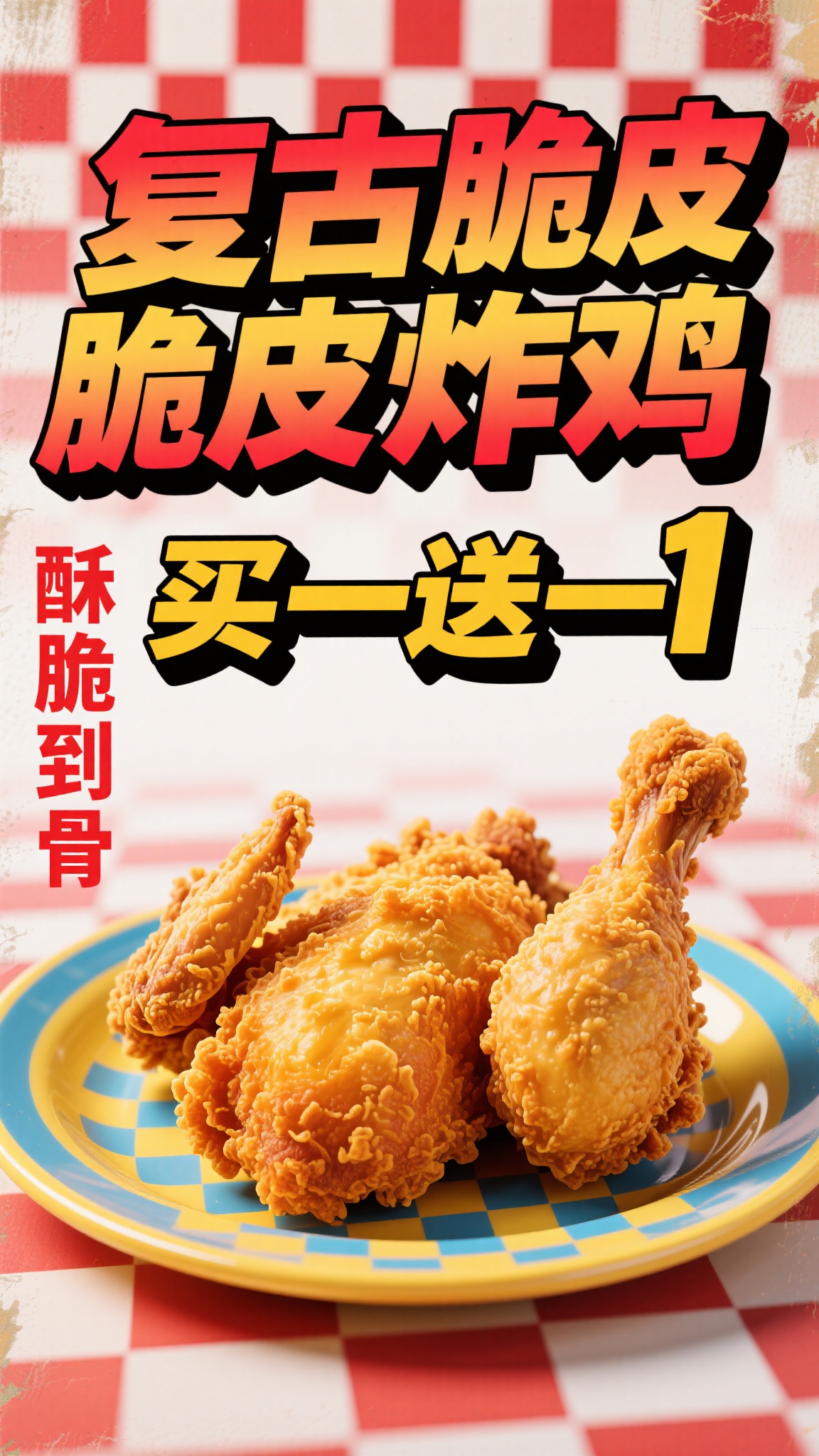 作品描述:3D 复古风炸鸡促销海报,核心载体是黄蓝格盘盛放的脆皮炸鸡(外皮金黄酥脆,肉质饱满,真实炸制质感);搭配红白格复古背景 + 做旧海报元素;主标题 “复古脆皮炸鸡 买一送一” 为红黄渐变立体字(字边描黑粗光,复古醒目);左侧有 “酥脆到骨” 红色竖排字;背景为红白格渐变,强化复古快餐的促销感。