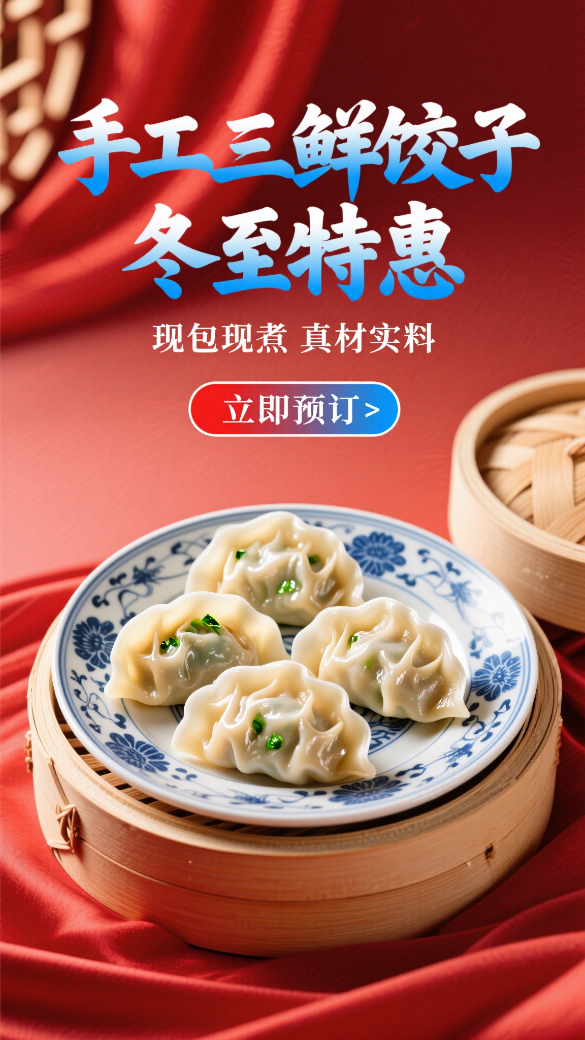 作品描述:3D 中式风饺子促销海报,核心载体是青花瓷盘盛放的三鲜饺子(皮薄馅大,蒸饺晶莹剔透,如家庭厨房出品);搭配木质蒸笼 + 红绸背景(营造中式节庆氛围);主标题 “手工三鲜饺子 冬至特惠” 为蓝白渐变书法字(大气典雅);副标题 “现包现煮 真材实料” 为白色细体;行动按钮为红蓝渐变 “立即预订” 按钮(哑光陶瓷质感);背景为红绸渐变,突出中式美食的传统感。