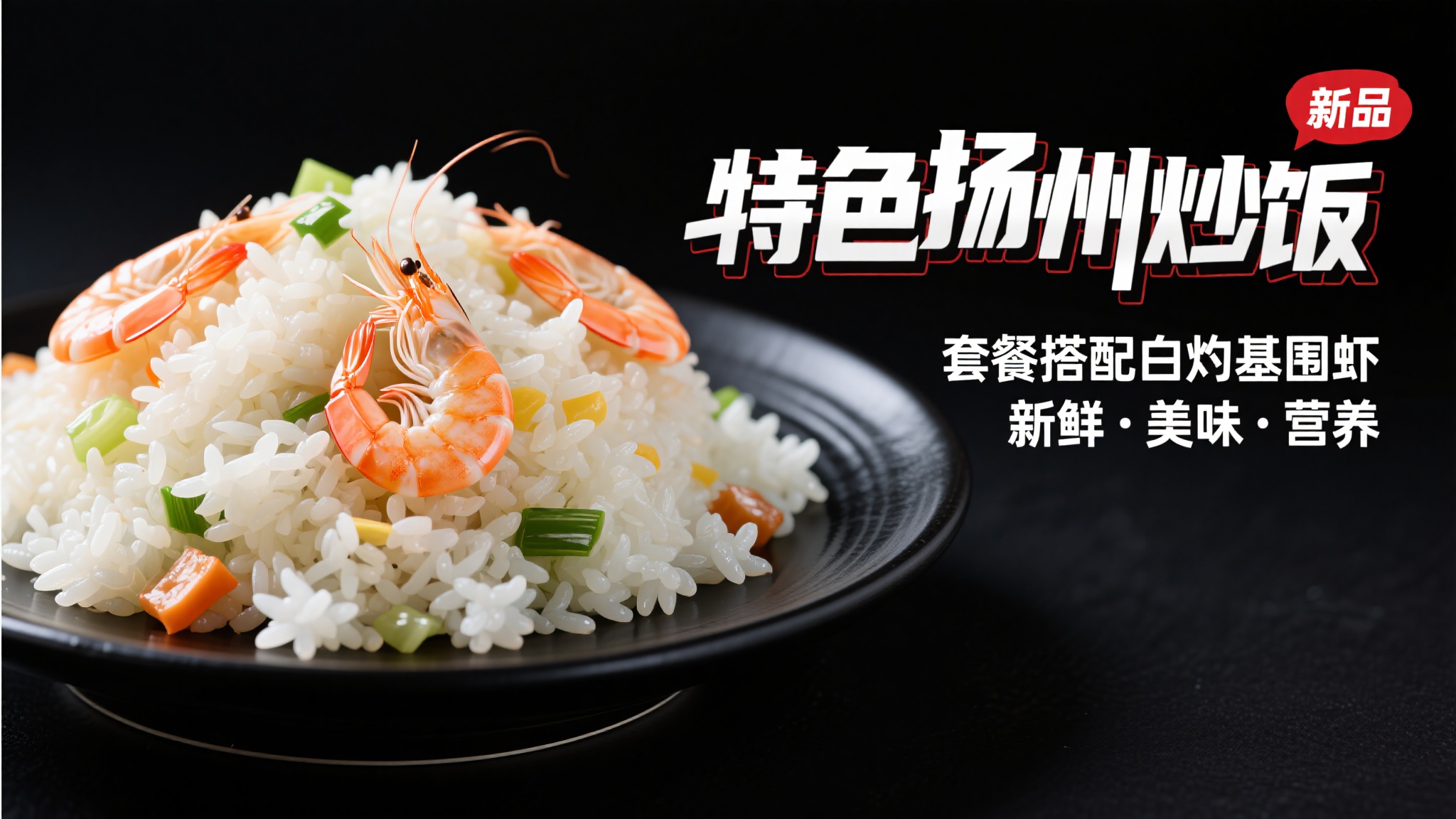 作品描述:3D 写实风扬州炒饭海报,核心载体是黑底盛放的扬州炒饭(米饭粒粒分明,搭配白灼基围虾,如餐厅出品);右上角有 “新品” 红标;主标题 “特色扬州炒饭” 为黑白渐变立体字(字边描红粗光),副标题 “套餐搭配白灼基围虾 新鲜美味营养” 为白色细体;背景纯黑,突出餐品精致感。