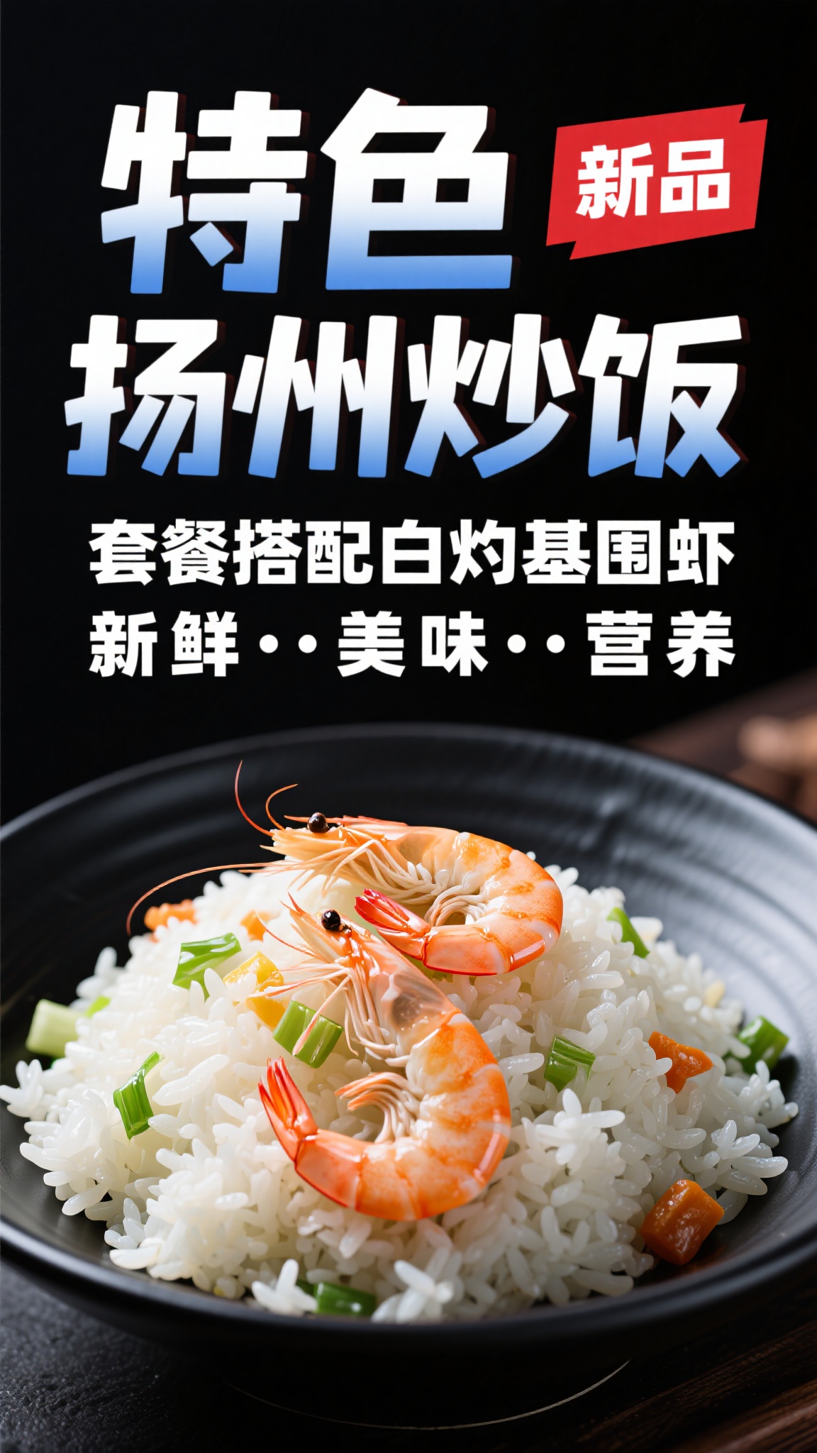 作品描述:3D 写实风扬州炒饭海报,核心载体是黑底盛放的扬州炒饭(米饭粒粒分明,搭配白灼基围虾,如餐厅出品);右上角有 “新品” 红标;主标题 “特色扬州炒饭” 为黑白渐变立体字(字边描红粗光),副标题 “套餐搭配白灼基围虾 新鲜美味营养” 为白色细体;背景纯黑,突出餐品精致感。