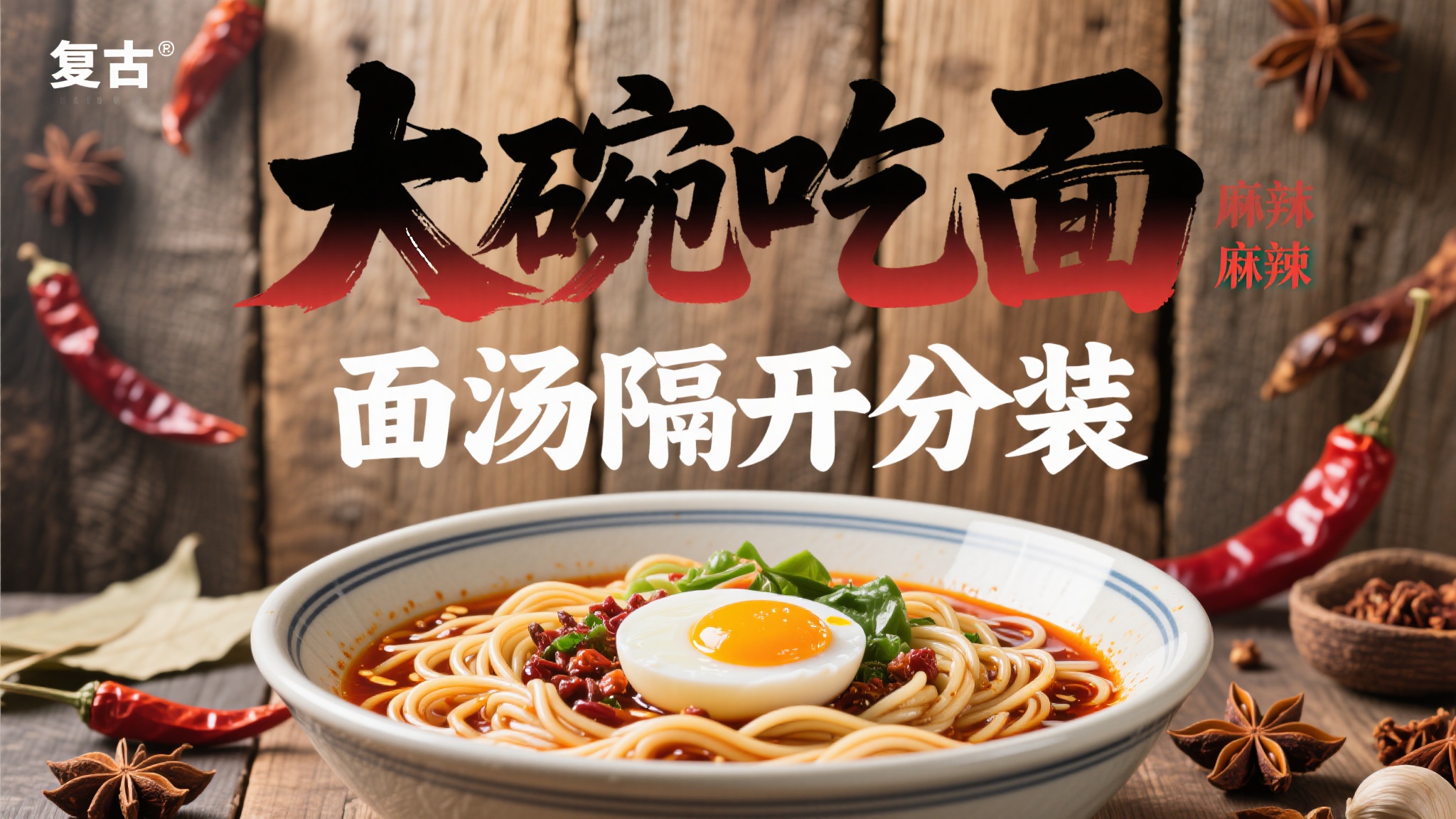 作品描述:3D 复古风大碗麻辣面海报,核心载体是木质背景的大碗麻辣面(面条筋道,溏心蛋点缀,如街头面馆出品);搭配 “面汤隔开分装” 白色细体;主标题 “大碗吃面 麻辣” 为黑红渐变书法字;周围有干辣椒、八角等香料装饰;背景木质纹理,突出复古烟火气。