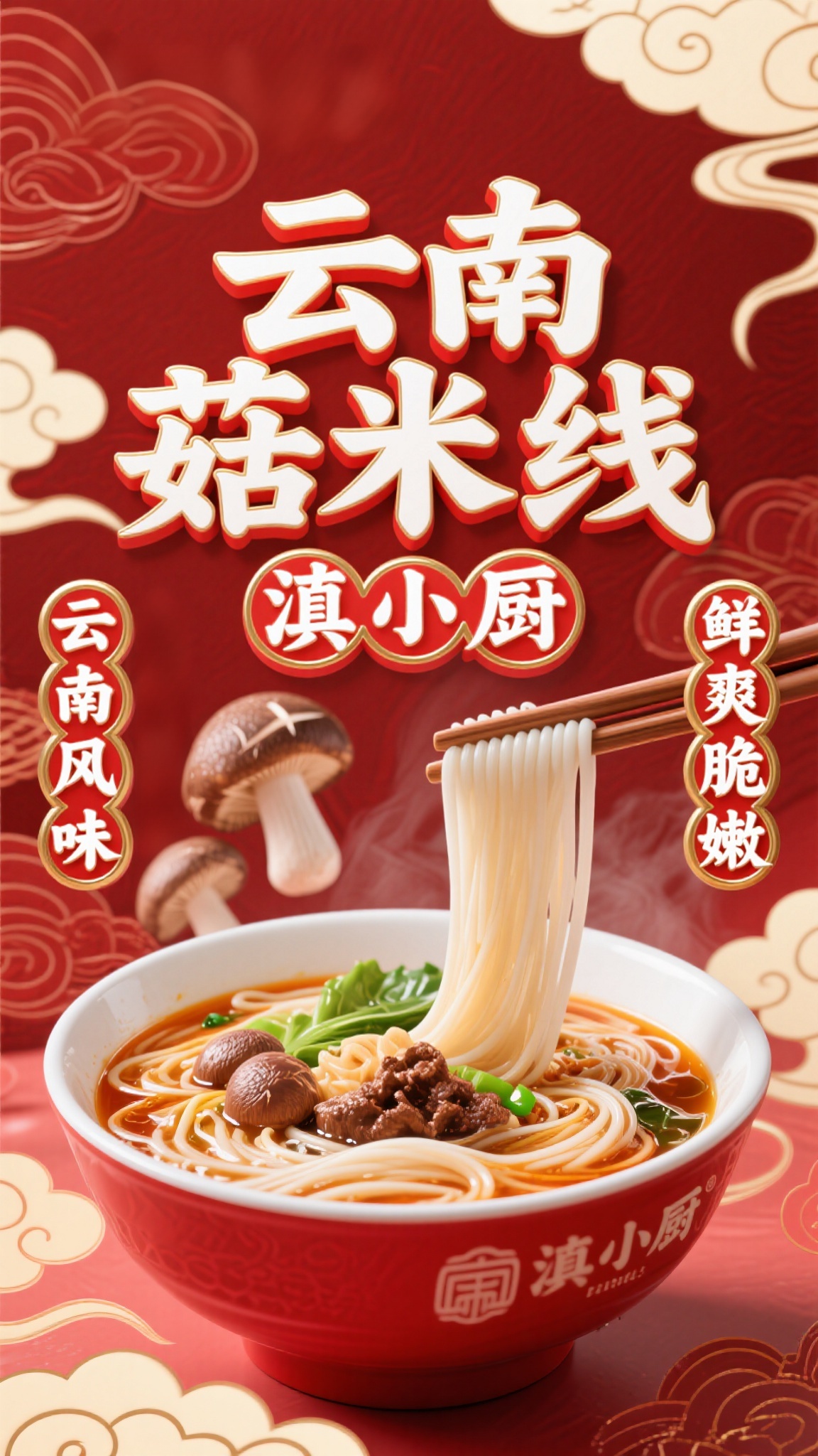 作品描述:3D 中式风云南米线海报,核心载体是红底滇小厨的菌菇米线(米线路滑、牛肉鲜嫩,菌菇汤底鲜爽);左侧 “云南风味”、右侧 “鲜爽脆嫩” 为中式竖排字;主标题 “云南菌菇米线 滇小厨” 为红白渐变立体字(字边描金粗光);背景红底云纹,强化云南传统感。