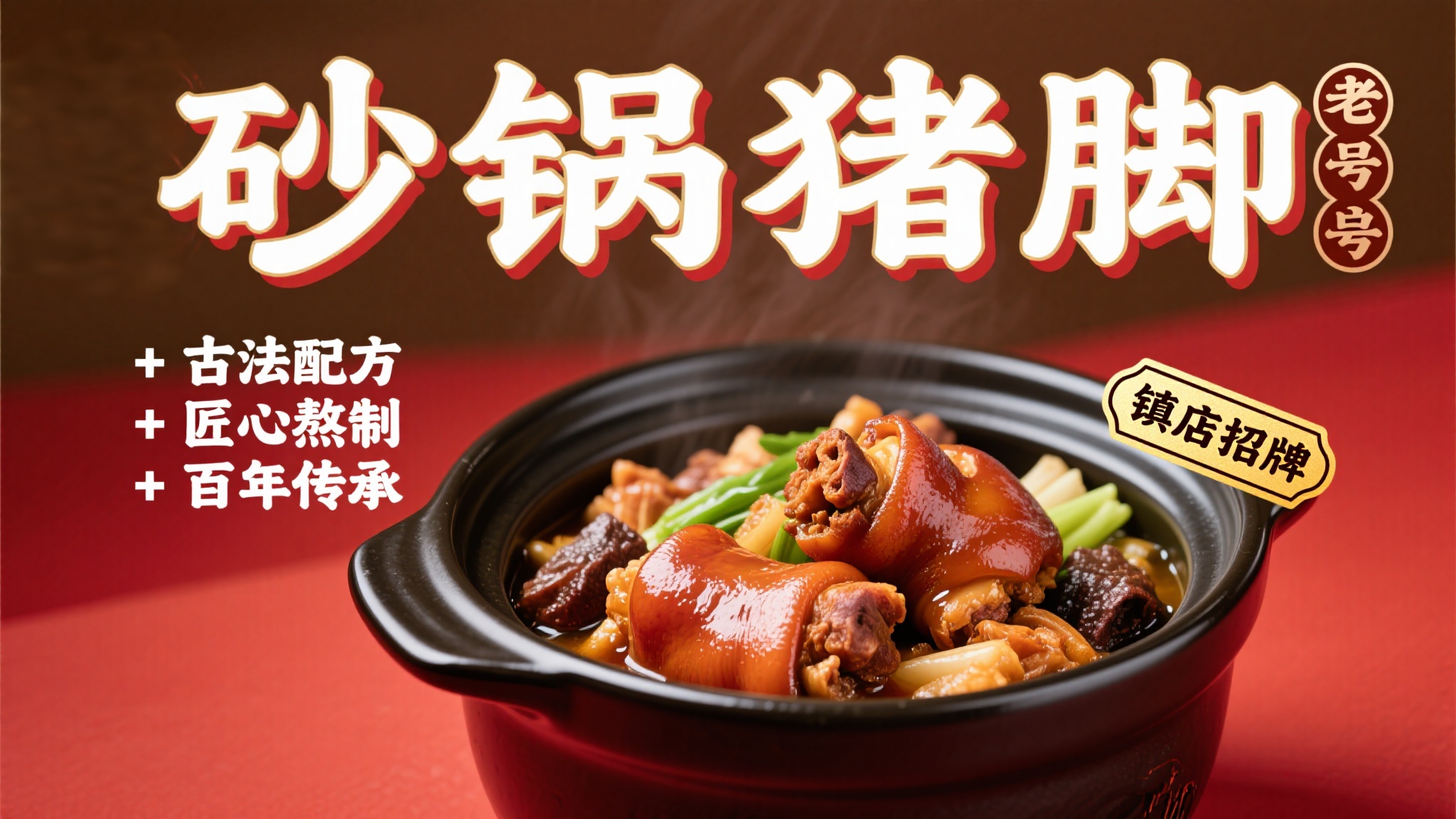 作品描述:3D 古法风砂锅猪脚海报,核心载体是红底黑陶砂锅猪脚(猪脚软烂,配料丰富,如老字号出品);搭配 “古法配方 + 匠心熬制 + 百年传承” 白色细体;主标题 “砂锅猪脚” 为黑红渐变立体字(字边描金粗光),右侧 “镇店招牌” 金黄标贴;背景红棕渐变,强化古法厚重感。