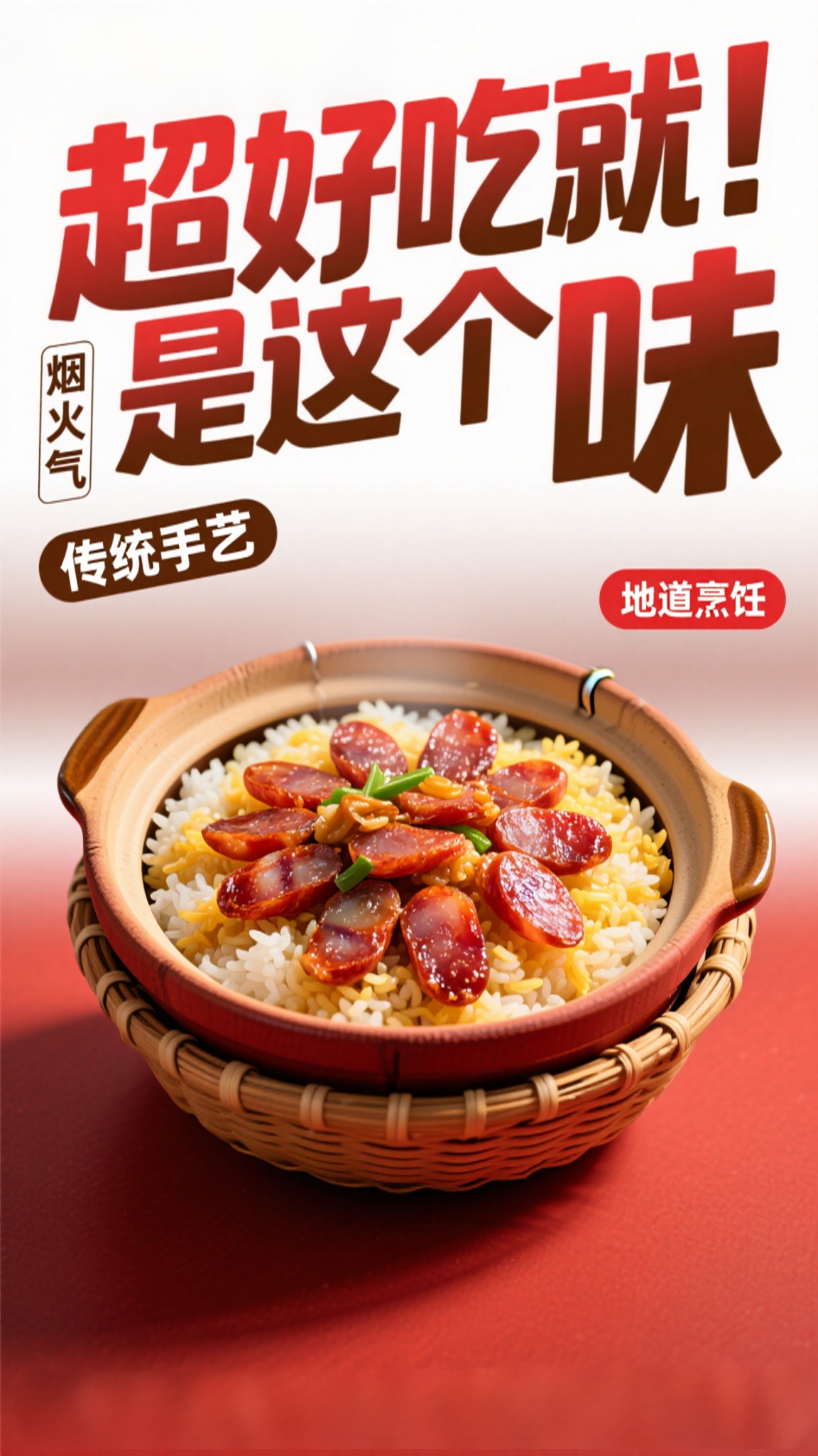 作品描述:3D 写实风煲仔饭海报,核心载体是红底竹篮腊肠煲仔饭(腊肠均匀,米饭金黄,如现做餐品);主标题 “超好吃就是这个味” 为红棕渐变立体字(字边描白粗光),左侧 “传统手艺”、右侧 “地道烹饪” 红标;背景红棕渐变,突出烟火气。