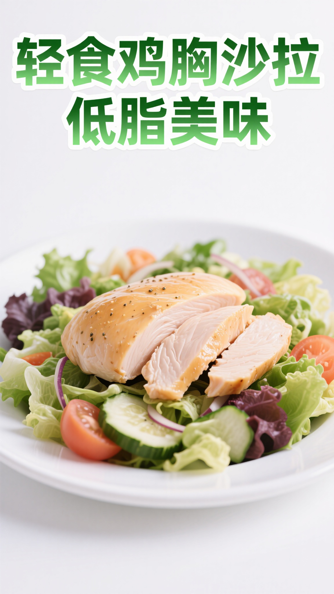 作品描述:3D 轻食风鸡胸沙拉海报,核心载体是白底鸡胸沙拉(鸡胸肉鲜嫩,蔬菜新鲜,如健身餐出品);主标题 “轻食鸡胸沙拉 低脂美味” 为绿白渐变立体字(字边描绿粗光);背景纯白,突出轻食清爽感。