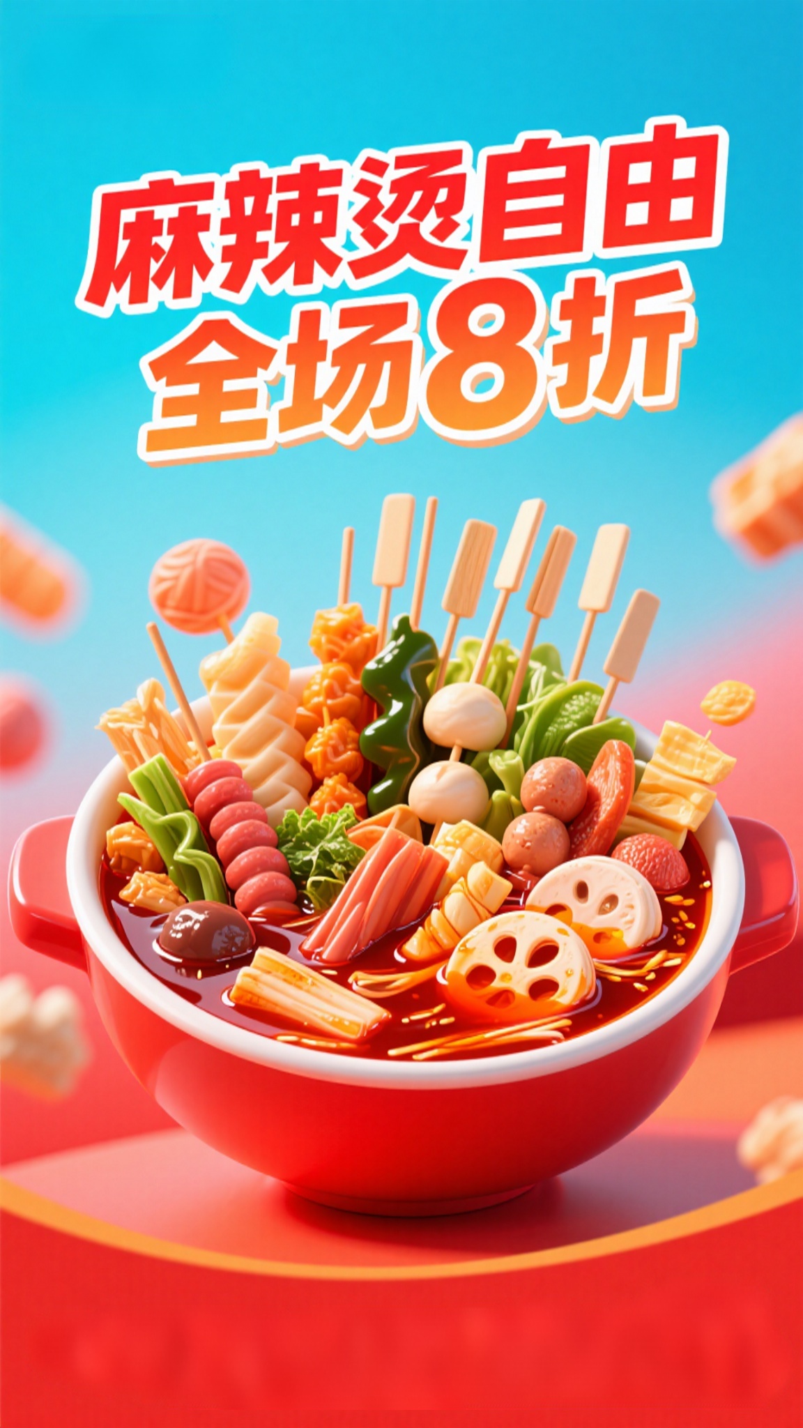 作品描述:3D 促销风麻辣烫海报,核心载体是红底麻辣烫(食材丰富,红油汤底,如连锁麻辣烫店出品);主标题 “麻辣烫自由 全场8折” 为红橙渐变立体字(字边描白粗光);背景红橙渐变,强化促销热烈感。
