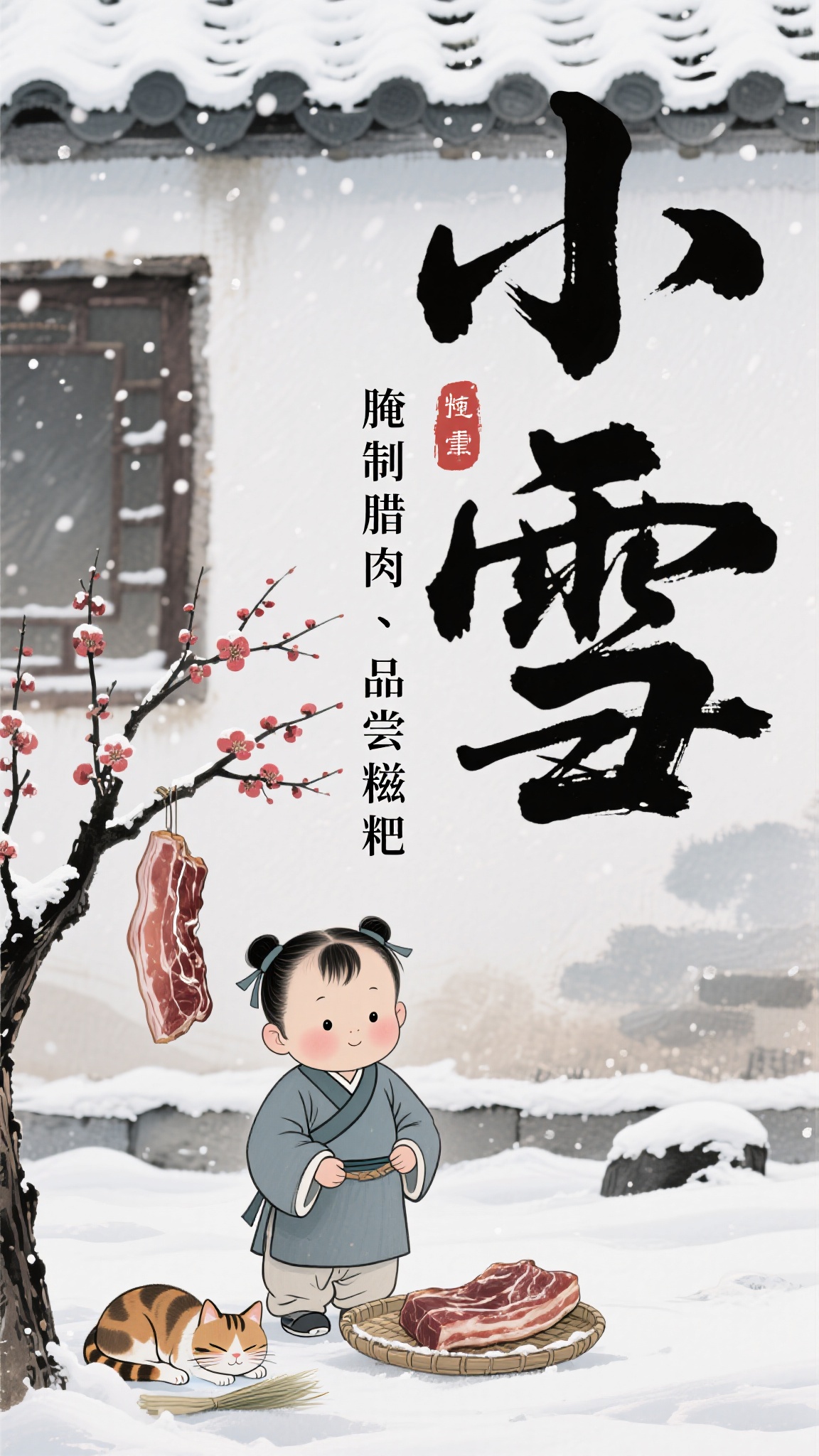 作品描述:水墨国风风格,小雪海报,古装萌娃腌腊肉,旁有梅花树、贪睡猫咪,雪地庭院背景,“小雪”“腌制腊肉品尝糍粑” 毛笔书法字,水墨晕染质感