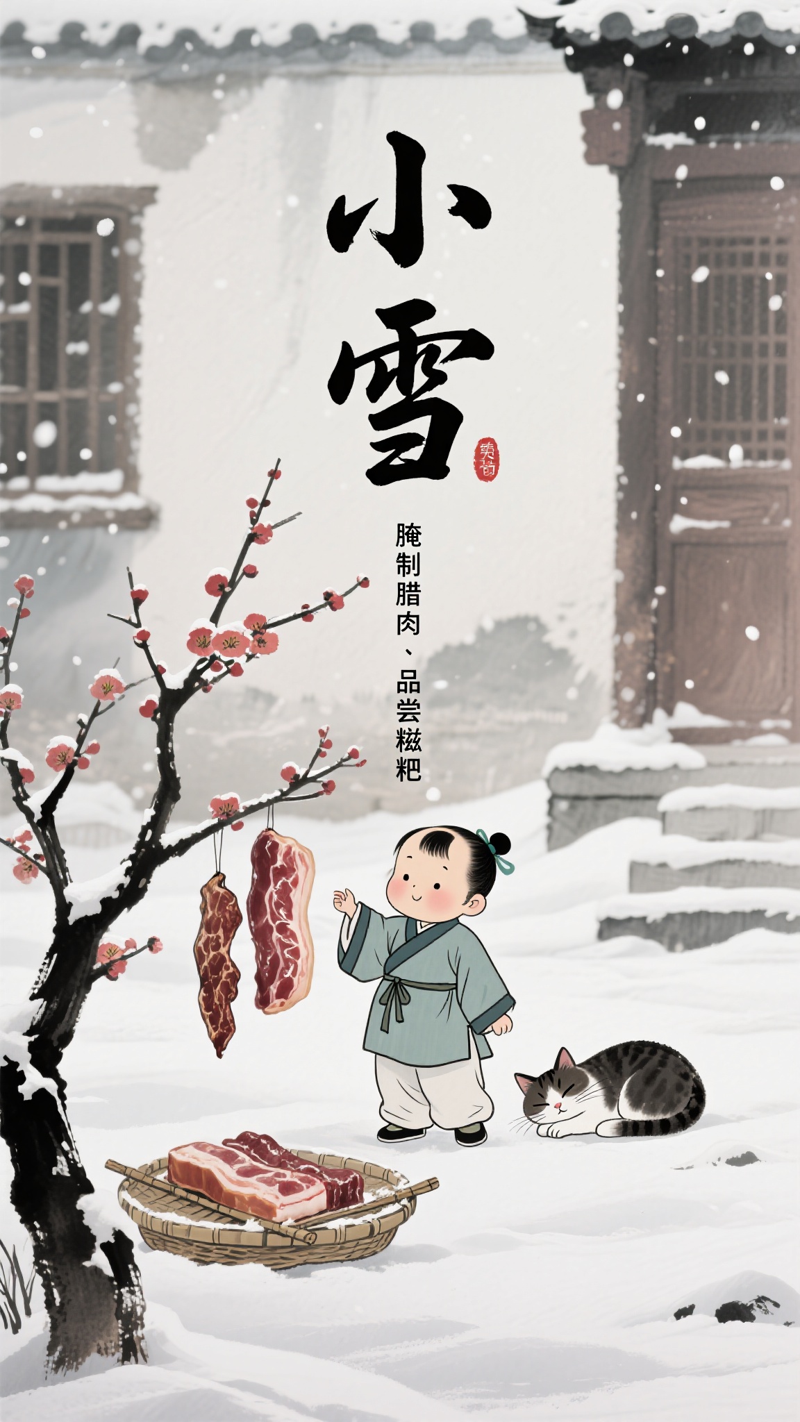 作品描述:水墨国风风格,小雪海报,古装萌娃腌腊肉,旁有梅花树、贪睡猫咪,雪地庭院背景,“小雪”“腌制腊肉品尝糍粑” 毛笔书法字,水墨晕染质感