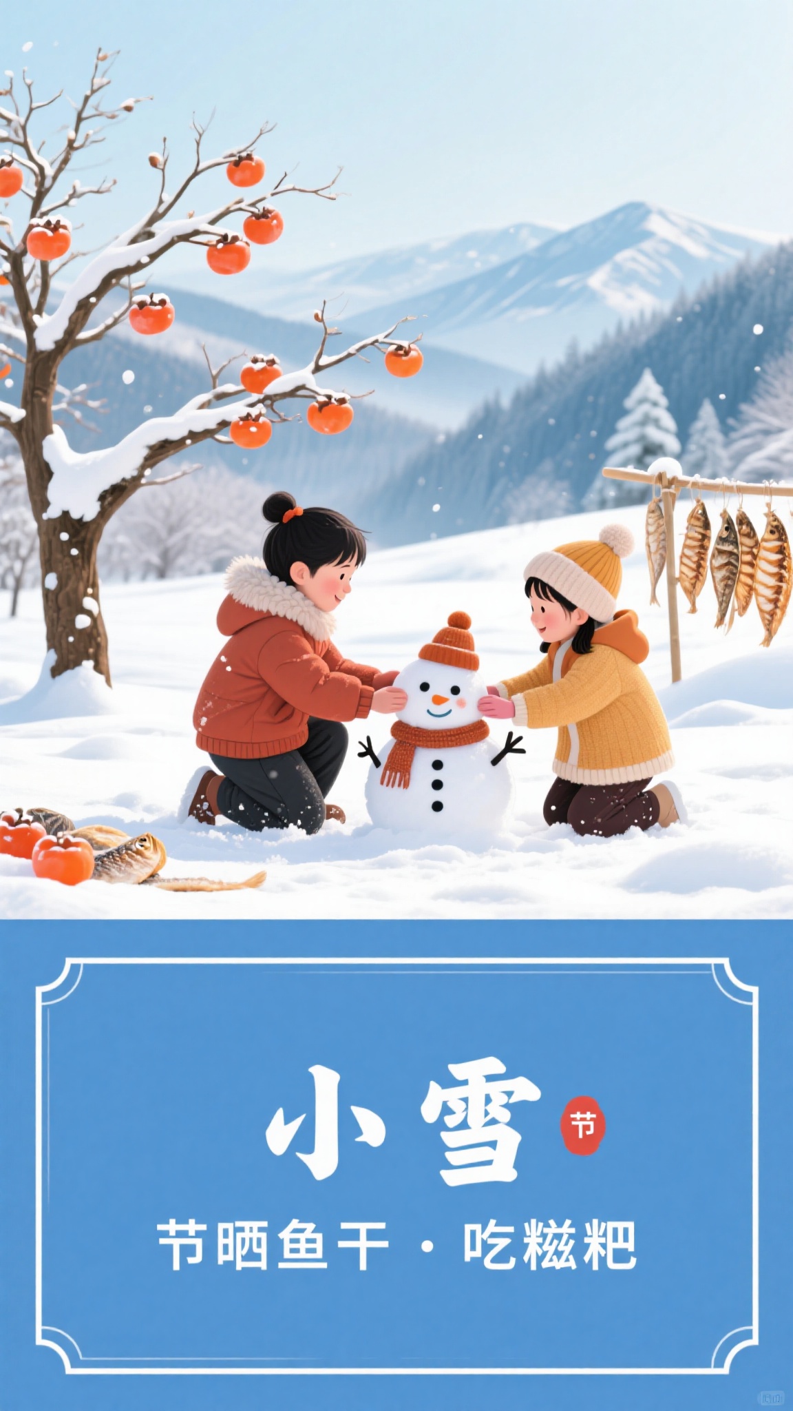 作品描述:亲子互动风格,小雪海报,亲子雪地堆雪人,背景柿树覆雪、远山雪景,下方 “小雪”“节晒鱼干吃糍粑” 文字框,蓝白清新色调