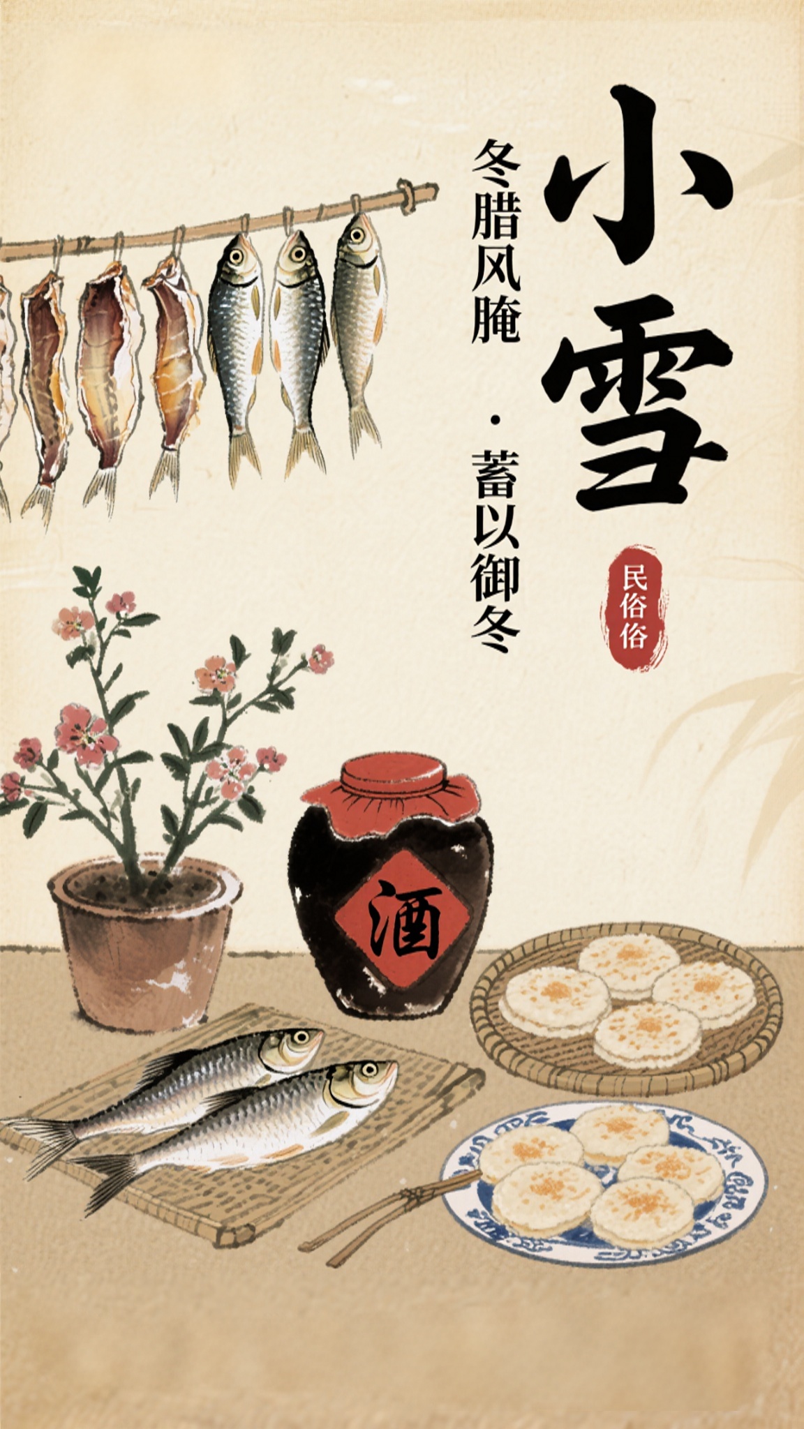 作品描述:复古民俗风格,小雪海报,晒鱼干、腌酒坛、糍粑摆盘,搭配盆栽、花卉,米黄做旧背景,“小雪”“冬腊风腌蓄以御冬” 文字,水墨插画质感