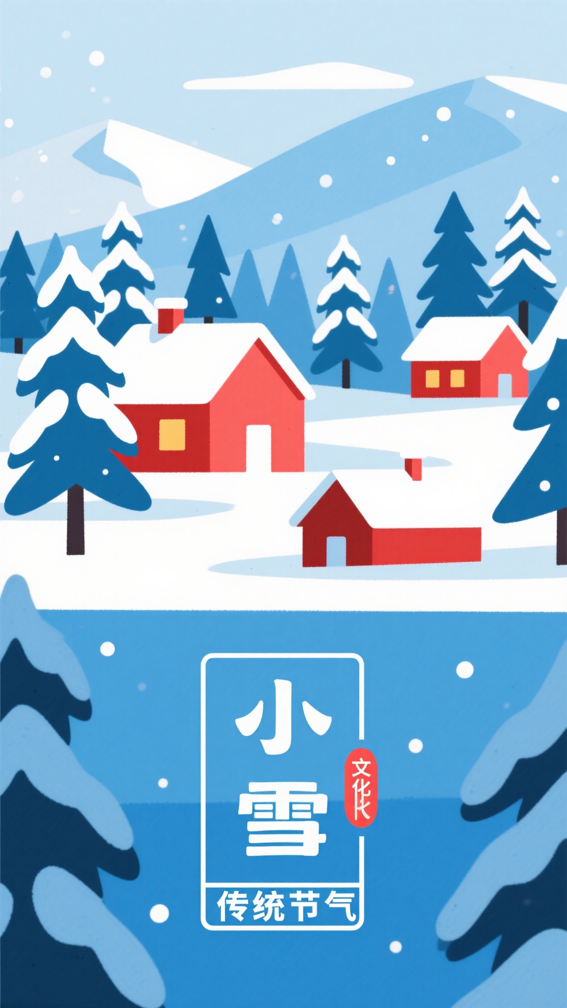 作品描述:扁平风景风格,小雪海报,蓝白雪景村庄(红屋、雪松错落),下方 “小雪”“传统节气”习俗文字框,简约扁平风