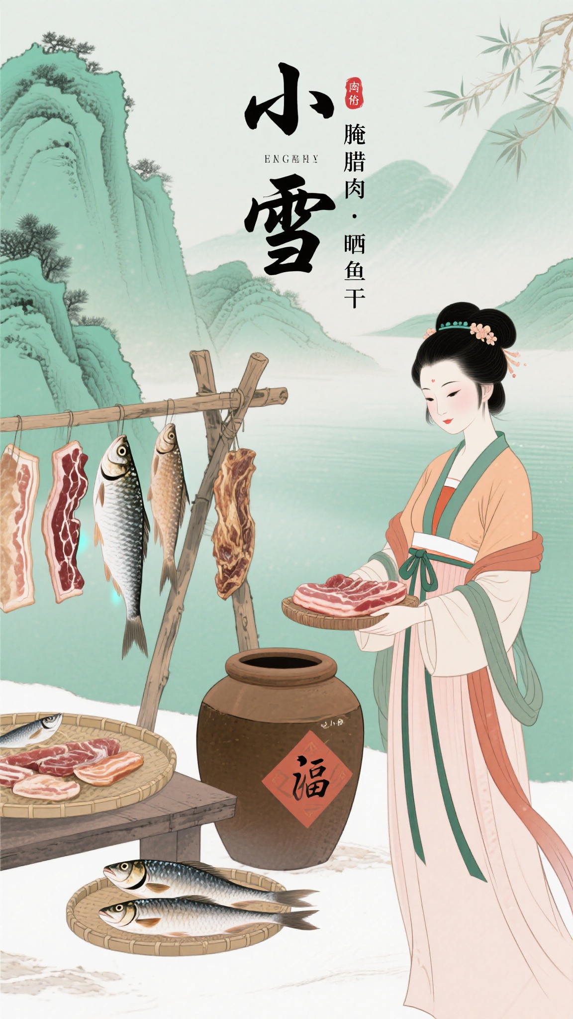 作品描述:古风民俗风格,小雪海报,古装女子端腊肉,旁有腌坛、晒鱼干木架,青绿山水背景,“小雪”“腌腊肉晒鱼干” 文字,工笔插画风格