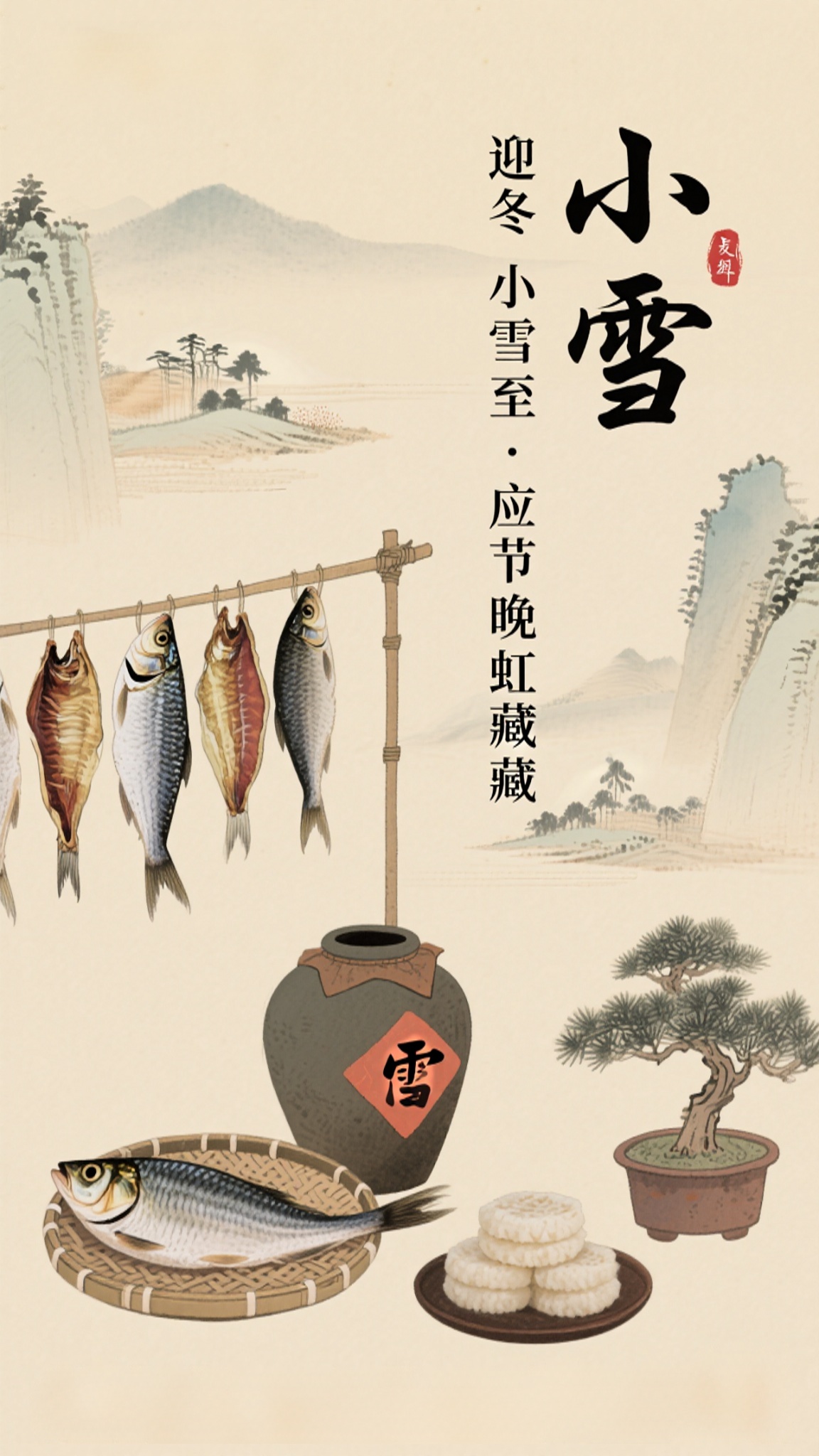 作品描述:复古饮食风格,小雪海报,晒鱼干、酒坛、糍粑、盆栽,米黄背景带山水淡影,“小雪”“迎冬小雪至应节晚虹藏” 文字,水墨淡彩风格