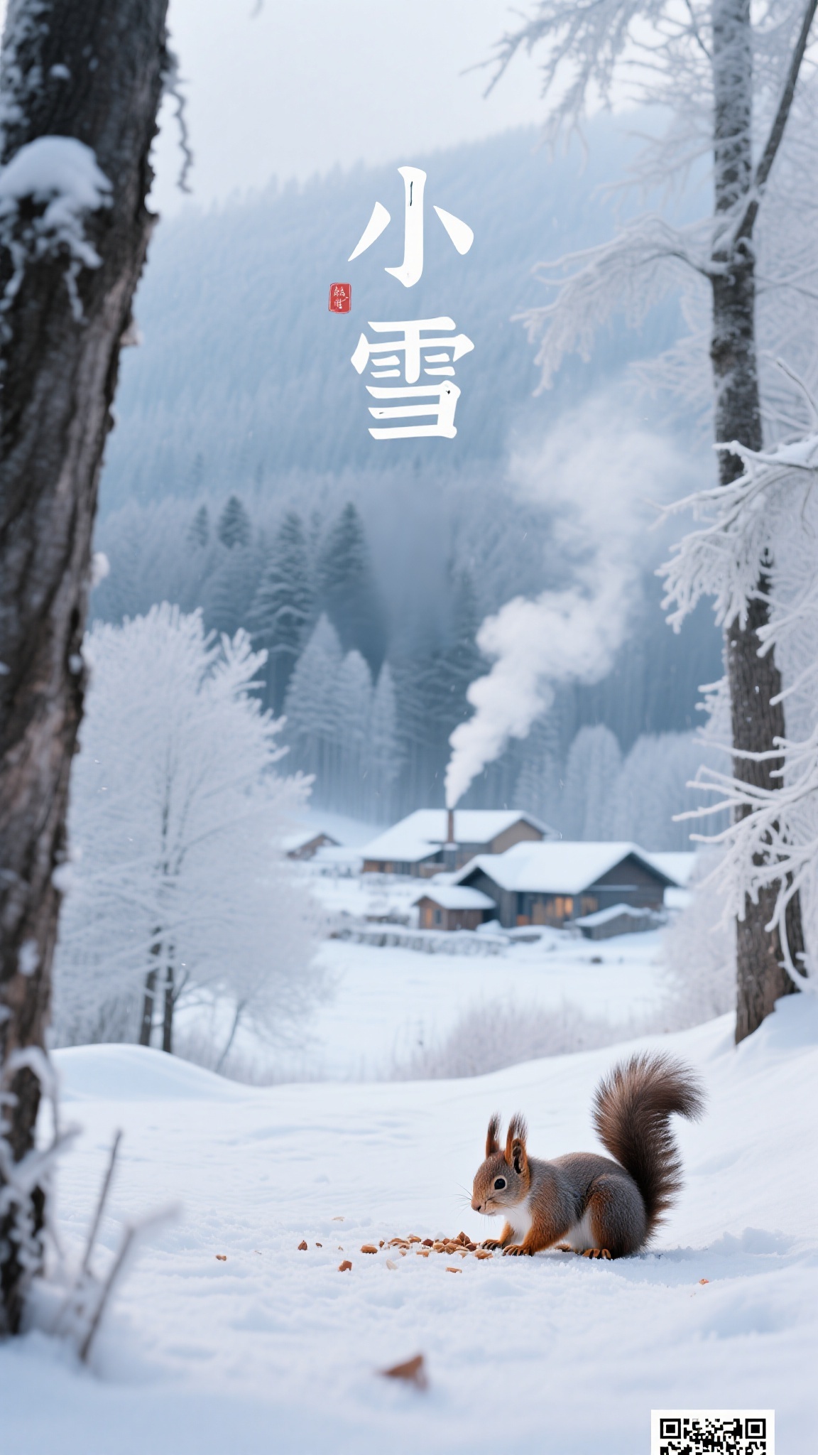 作品描述:自然写实风格,小雪海报,雾凇覆盖的树林、雪地觅食的松鼠,远处村落炊烟袅袅,“小雪”“自然之美” 文字,写实摄影质感,冷蓝清新色调
