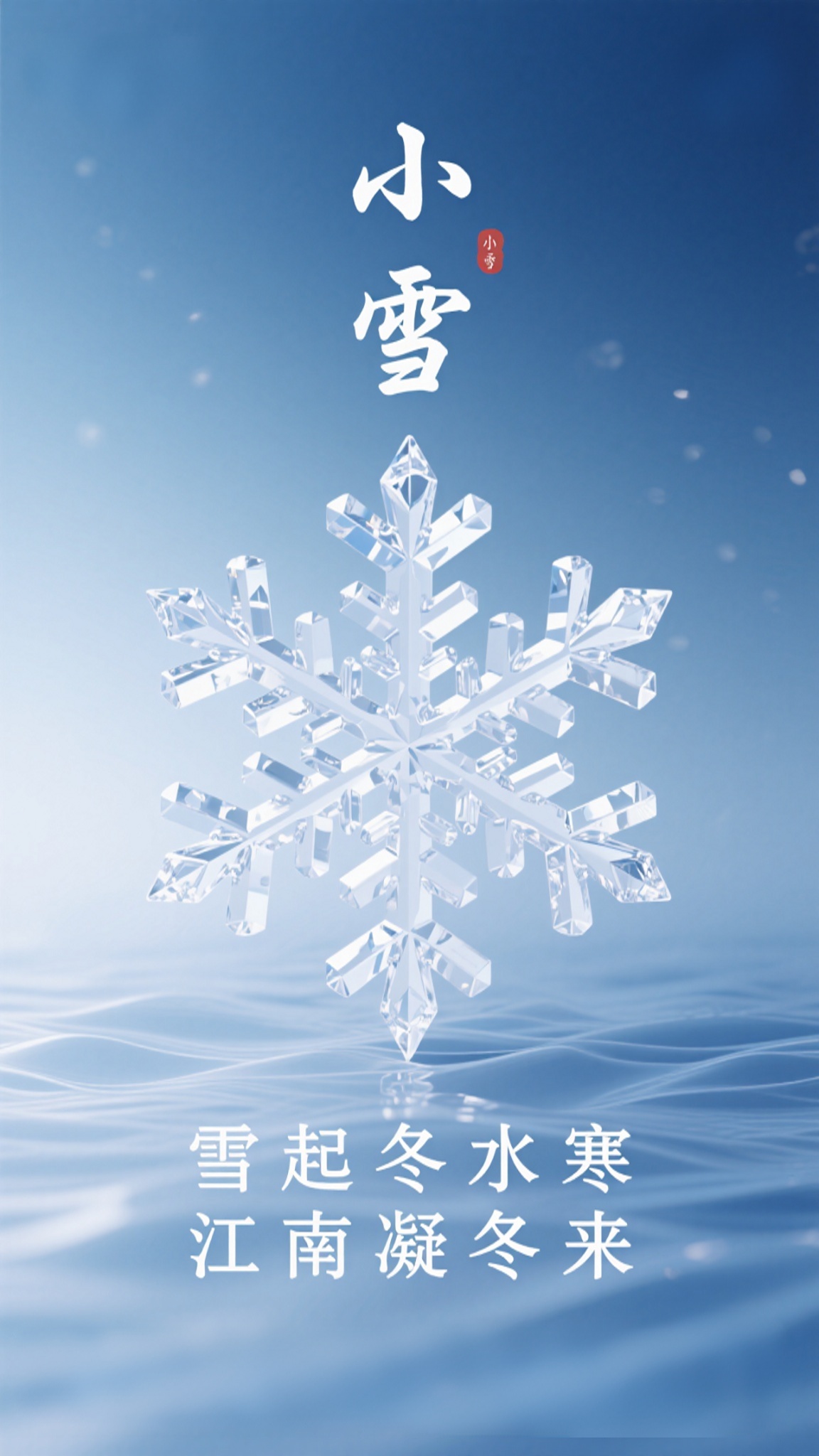 作品描述:极简雪花风格,小雪海报,蓝白渐变雪花纹理背景,立体晶体雪花元素,“小雪”“雪起冬水寒 江南凝冬来” 书法字,极简高级风
