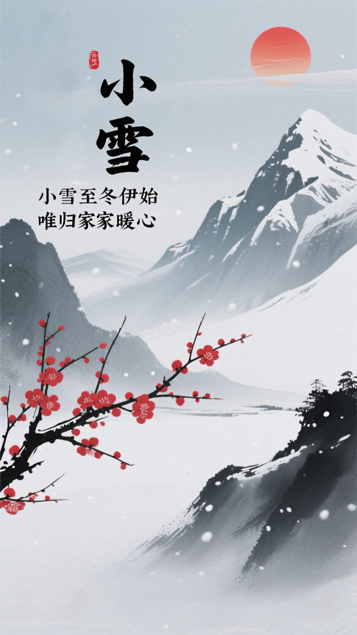 作品描述:水墨山水风格,小雪海报,水墨雪山与红梅枝,红日点缀画面,“小雪”“小雪至冬伊始 唯归家暖心” 文字,国风雅致