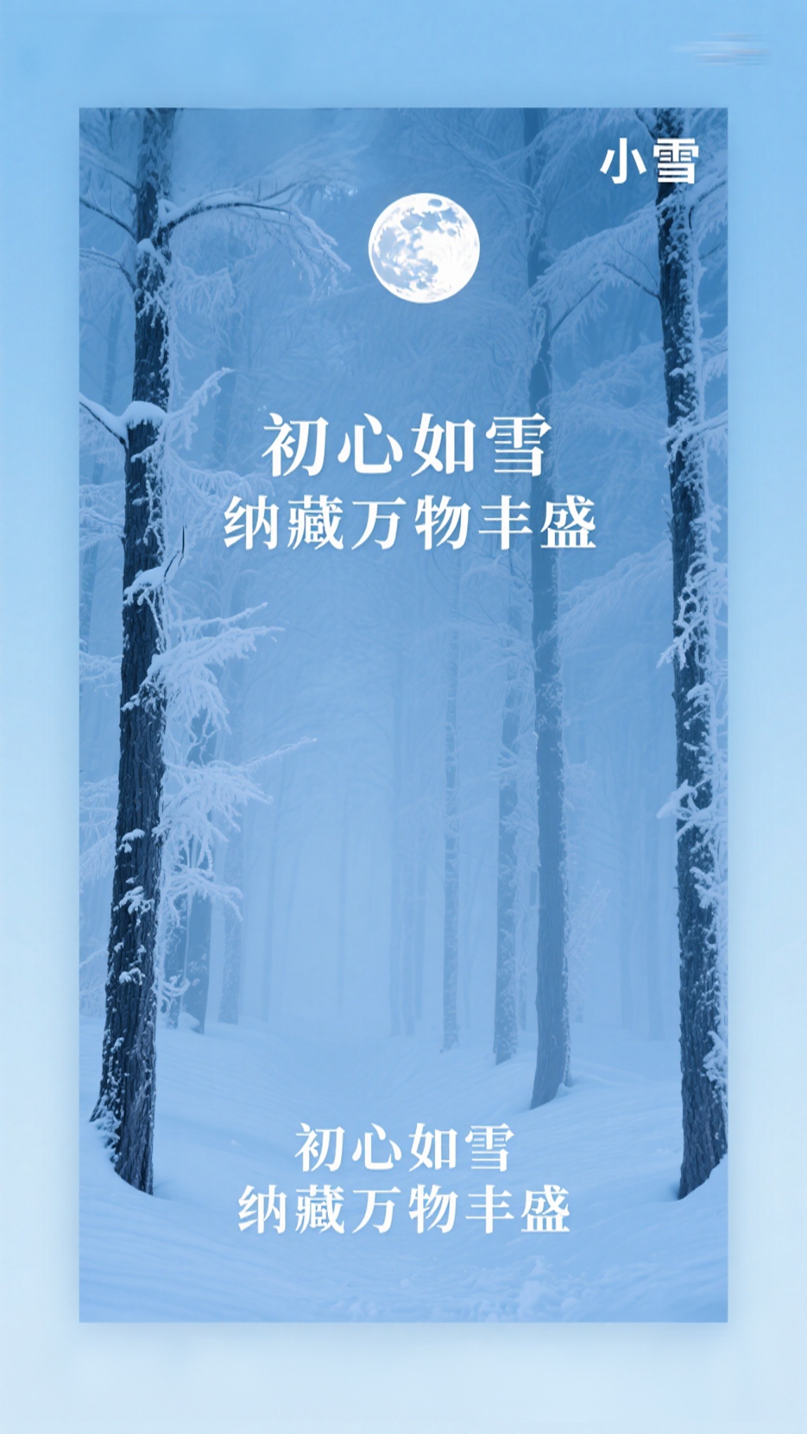 作品描述:雾凇林风格,小雪海报,雾凇树林雪景(圆月点缀),“初心如雪 纳藏万物丰盛” 文字,冷蓝写实色调