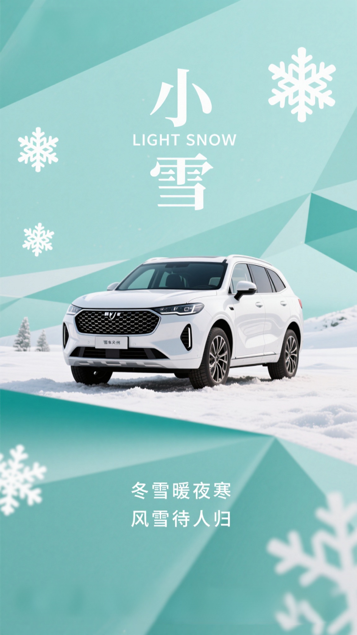 作品描述:汽车行业风格,小雪海报,浅薄荷绿背景,几何雪花元素点缀,白色 SUV 汽车主体,“小雪 LIGHT SNOW 冬雪暖夜寒 风雪待人归” 文字,现代简约风