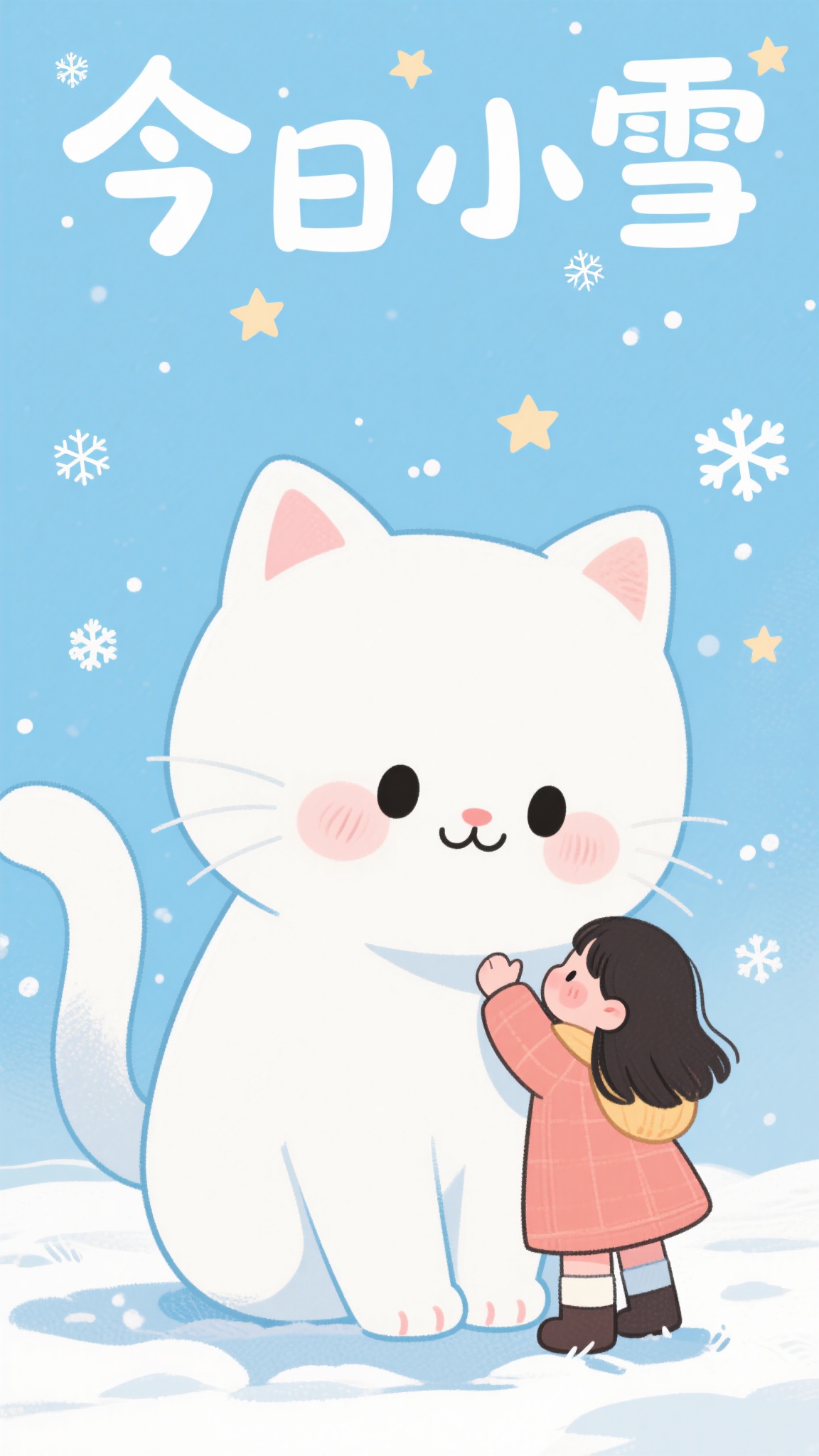作品描述:萌系插画风格,小雪海报,浅蓝背景,巨型白猫咪与小女孩互动,“今日小雪”艺术字,星星雪花点缀