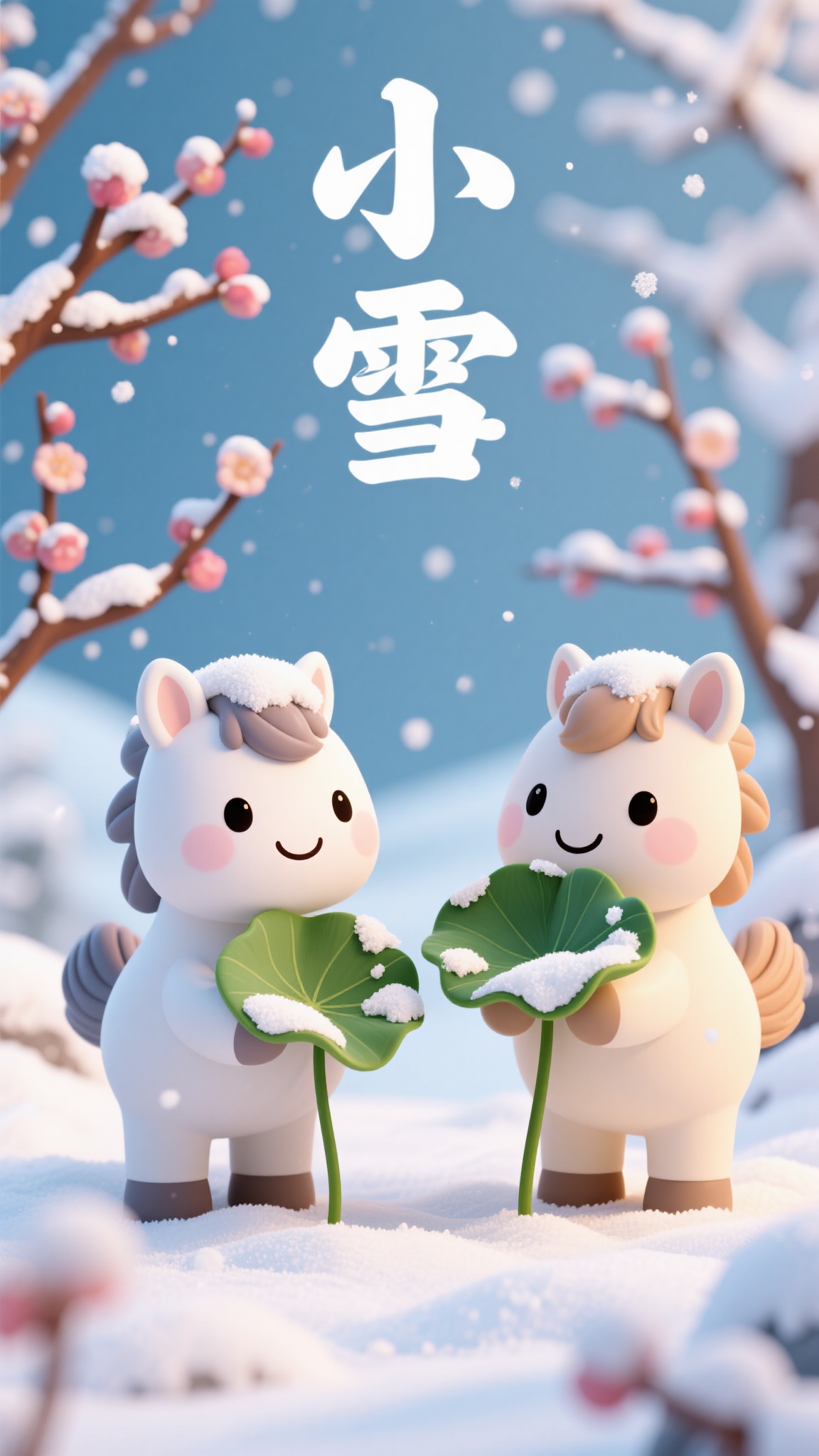 作品描述:3D 萌物风格,小雪海报,雪覆梅枝背景,两只萌马持荷叶挡雪,“小雪” 文字,可爱 3D 质感