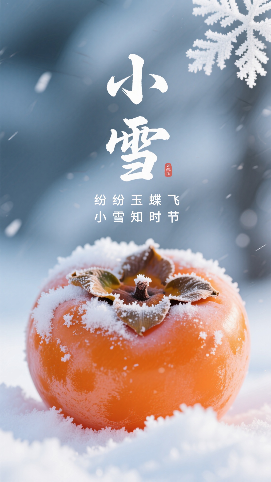 作品描述:霜柿特写风格,小雪海报,雪覆橙柿特写,“小雪” “纷纷玉蝶飞 小雪知时节” 书法字,冷调雪景背景