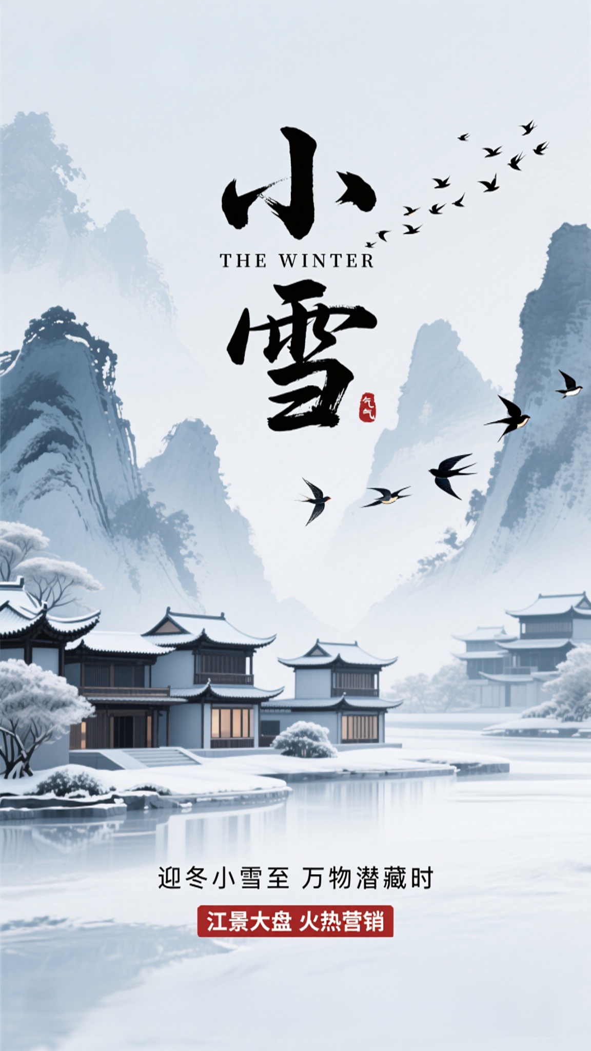 作品描述:3D 雅致水墨风小雪地产海报,核心载体是水墨山水建筑群(蓝灰调山水与古建融合,营造诗意栖居场景);搭配水墨飞鸟群(编队飞动动效);主标题 “小雪” 书法字与 “THE WINTER” 英文呼应,节气文案 “迎冬小雪至 万物潜藏时” 强化节气意境;地产信息 “江景大盘 火热营销” 突出价值点;背景以水墨晕染呈现,强化雅致地产的文化属性。