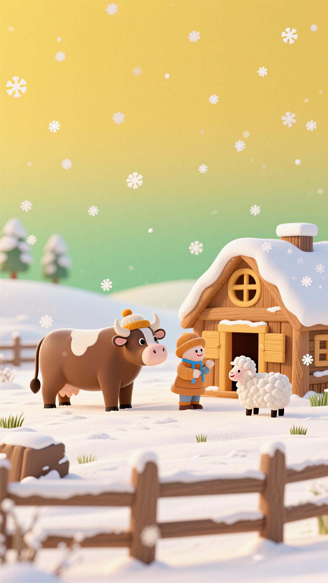 作品描述:3D 绘本风插画,核心载体是黄绿渐变农场场景,雪地上牛、羊(戴帽)与木屋互动,每秒 5 帧雪花飘落;背景为黄绿渐变,营造绘本温馨感。