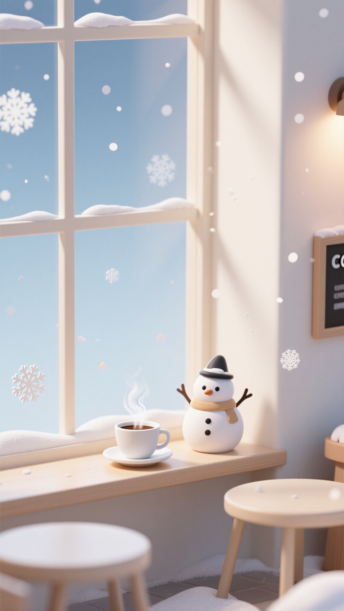 作品描述:3D 韩系风插画,核心载体是米白渐变韩系场景,咖啡店窗台上热咖啡(带蒸汽)与雪人摆件,每秒 5 帧雪花轻柔飘落;背景为米蓝渐变,突出韩系的治愈慵懒感。
