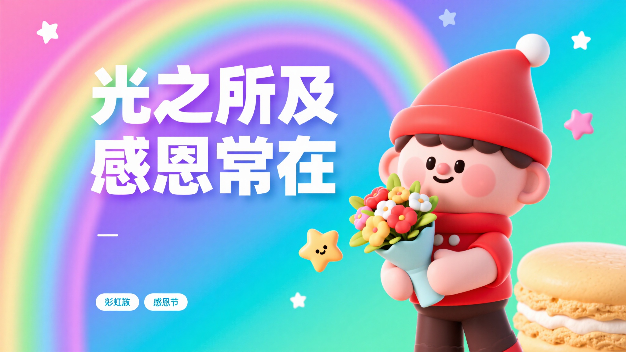 作品描述:彩虹渐变马卡龙风感恩节海报,含 “光之所及 感恩常在” 白色粗体字、,搭配 3D 红帽卡通人物(持花束、旁有星星角色);背景彩虹渐变(粉紫→蓝绿),点缀星星。